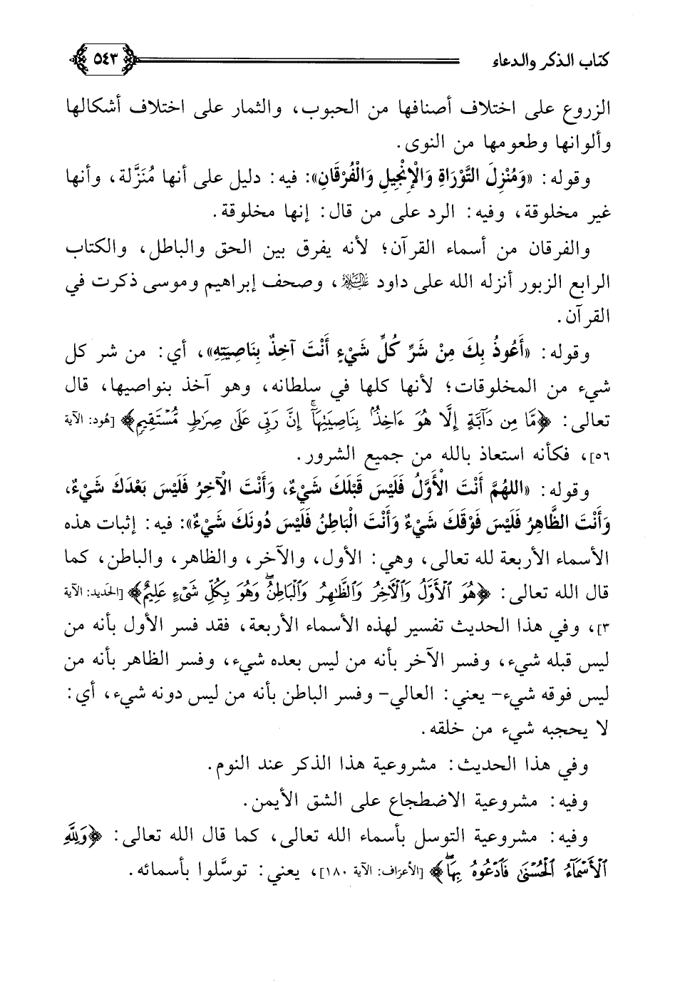وقوله: ((اللَّهُمَّ أَنْتَ الْأَوَّلُ فَلَيْسَ قَبْلَكَ شَيْءٌ، وَأَنْتَ الْآخِرُ فَلَيْسَ بَعْدَكَ شَيْءٌ، وَأَنْتَ الظَّاهِرُ فَلَيْسَ فَوْقَكَ شَيْءٌ وَأَنْتَ الْبَاطِنُ فَلَيْسَ دُونَكَ شَيْءٌ)): فيه: إثبات هذه الأسماء الأربعة لله تعالى، وهي: الأول، والآخر، والظاهر، والباطن، كما قال الله تعالى: {هو الأول والآخر والظاهر والباطن وهو بكل شي عليم}، وفي هذا الحديث تفسير لهذه الأسماء الأربعة، فقد فسر الأول بأنه من ليس قبله شيء، وفسر الآخر بأنه من ليس بعده شيء، وفسر الظاهر بأنه من ليس فوقه شيء- يعني: العالي- وفسر الباطن بأنه من ليس دونه شيء، أي: لا يحجبه شيء من خلقه.