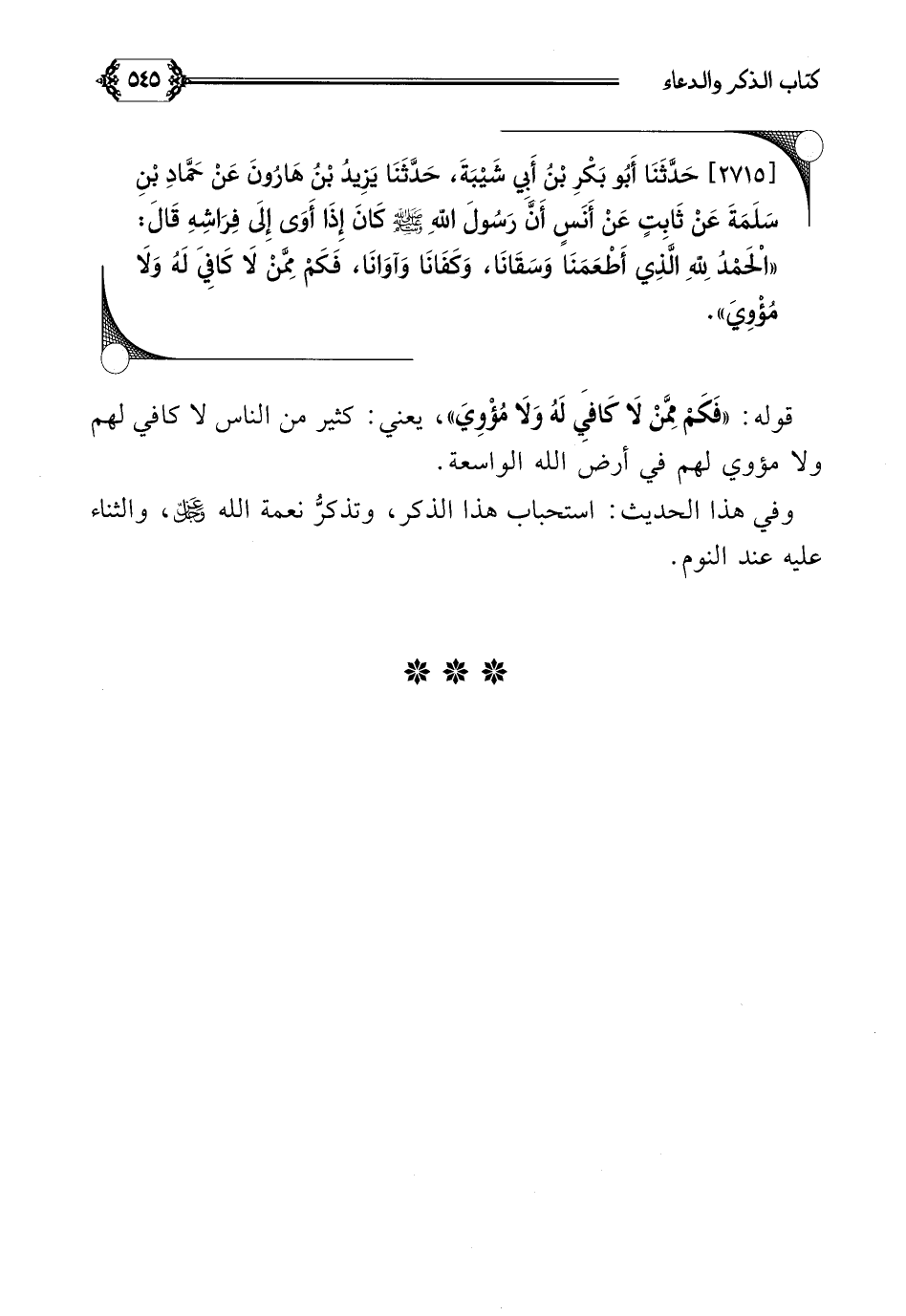 [٢٧١٥] حَدَّثَنَا أَبُو بَكْرِ بْنُ أَبِي شَيْبَةَ، حَدَّثَنَا يَزِيدُ بْنُ هَارُونَ عَنْ حَمَّادِ بْنِ سَلَمَةَ عَنْ ثَابِتٍ عَنْ أَنَسٍ أَنَّ رَسُولَ اللَّهِ صلى الله عليه وسلم كَانَ إِذَا أَوَى إِلَى فِرَاشِهِ قَالَ: ((الْحَمْدُ لِلَّهِ الَّذِي أَطْعَمَنَا وَسَقَانَا، وَكَفَانَا وَآوَانَا، فَكَمْ مِمَّنْ لَا كَافِيَ لَهُ وَلَا مُؤْوِيَ)).