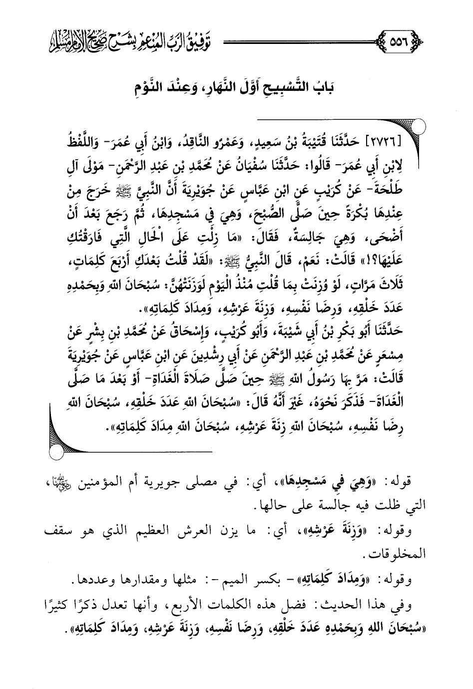 [٢٧٢٦] حَدَّثَنَا قُتَيْبَةُ بْنُ سَعِيدٍ، وَعَمْرٌو النَّاقِدُ، وَابْنُ أَبِي عُمَرَ- وَاللَّفْظُ لِابْنِ أَبِي عُمَرَ- قَالُوا: حَدَّثَنَا سُفْيَانُ عَنْ مُحَمَّدِ بْنِ عَبْدِ الرَّحْمَنِ- مَوْلَى آلِ طَلْحَةَ- عَنْ كُرَيْبٍ عَنِ ابْنِ عَبَّاسٍ عَنْ جُوَيْرِيَةَ أَنَّ النَّبِيَّ صلى الله عليه وسلم خَرَجَ مِنْ عِنْدِهَا بُكْرَةً حِينَ صَلَّى الصُّبْحَ، وَهِيَ فِي مَسْجِدِهَا، ثُمَّ رَجَعَ بَعْدَ أَنْ أَضْحَى، وَهِيَ جَالِسَةٌ، فَقَالَ: ((مَا زِلْتِ عَلَى الْحَالِ الَّتِي فَارَقْتُكِ عَلَيْهَا؟ ! )) قَالَتْ: نَعَمْ، قَالَ النَّبِيُّ صلى الله عليه وسلم: ((لَقَدْ قُلْتُ بَعْدَكِ أَرْبَعَ كَلِمَاتٍ، ثَلَاثَ مَرَّاتٍ، لَوْ وُزِنَتْ بِمَا قُلْتِ مُنْذُ الْيَوْمِ لَوَزَنَتْهُنَّ: سُبْحَانَ اللَّهِ وَبِحَمْدِهِ عَدَدَ خَلْقِهِ، وَرِضَا نَفْسِهِ، وَزِنَةَ عَرْشِهِ، وَمِدَادَ كَلِمَاتِهِ)).