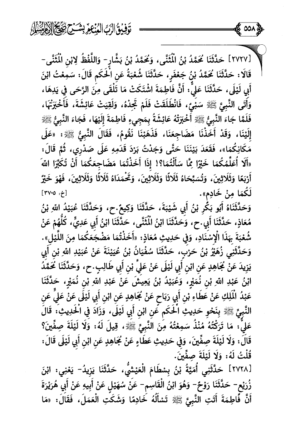 [٢٧٢٧] حَدَّثَنَا مُحَمَّدُ بْنُ الْمُثَنَّى، وَمُحَمَّدُ بْنُ بَشَّارٍ- وَاللَّفْظُ لِابْنِ الْمُثَنَّى- قَالَا: حَدَّثَنَا مُحَمَّدُ بْنُ جَعْفَرٍ، حَدَّثَنَا شُعْبَةُ عَنِ الْحَكَمِ قَالَ: سَمِعْتُ ابْنَ أَبِي لَيْلَى، حَدَّثَنَا عَلِيٌّ: أَنَّ فَاطِمَةَ اشْتَكَتْ مَا تَلْقَى مِنَ الرَّحَى فِي يَدِهَا، وَأَتَى النَّبِيَّ صلى الله عليه وسلم سَبْيٌ، فَانْطَلَقَتْ فَلَمْ تَجِدْهُ، وَلَقِيَتْ عَائِشَةَ، فَأَخْبَرَتْهَا، فَلَمَّا جَاءَ النَّبِيُّ صلى الله عليه وسلم أَخْبَرَتْهُ عَائِشَةُ بِمَجِيءِ فَاطِمَةَ إِلَيْهَا، فَجَاءَ النَّبِيُّ صلى الله عليه وسلم إِلَيْنَا، وَقَدْ أَخَذْنَا مَضَاجِعَنَا، فَذَهَبْنَا نَقُومُ، فَقَالَ النَّبِيُّ صلى الله عليه وسلم: ((عَلَى مَكَانِكُمَا))، فَقَعَدَ بَيْنَنَا حَتَّى وَجَدْتُ بَرْدَ قَدَمِهِ عَلَى صَدْرِي، ثُمَّ قَالَ: ((أَلَا أُعَلِّمُكُمَا خَيْرًا مِمَّا سَأَلْتُمَا؟ ! إِذَا أَخَذْتُمَا مَضَاجِعَكُمَا أَنْ تُكَبِّرَا اللَّهَ أَرْبَعًا وَثَلَاثِينَ، وَتُسَبِّحَاهُ ثَلَاثًا وَثَلَاثِينَ، وَتَحْمَدَاهُ ثَلَاثًا وَثَلَاثِينَ، فَهْوَ خَيْرٌ لَكُمَا مِنْ خَادِمٍ)).