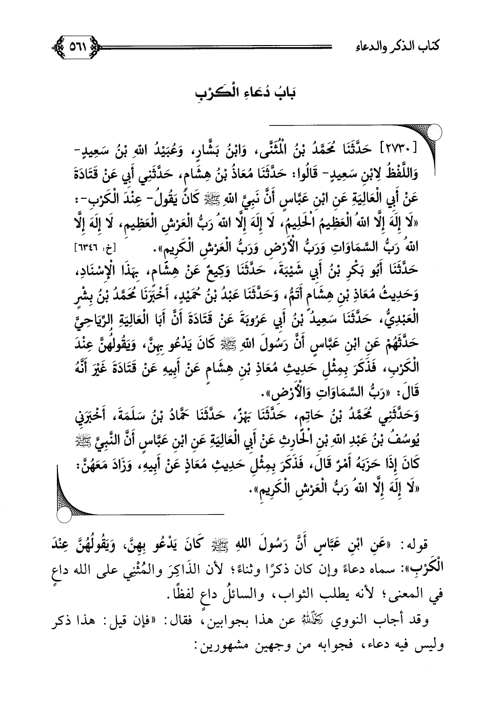 [٢٧٣٠] حَدَّثَنَا مُحَمَّدُ بْنُ الْمُثَنَّى، وَابْنُ بَشَّارٍ، وَعُبَيْدُ اللَّهِ بْنُ سَعِيدٍ- وَاللَّفْظُ لِابْنِ سَعِيدٍ- قَالُوا: حَدَّثَنَا مُعَاذُ بْنُ هِشَامٍ، حَدَّثَنِي أَبِي عَنْ قَتَادَةَ عَنْ أَبِي الْعَالِيَةِ عَنِ ابْنِ عَبَّاسٍ أَنَّ نَبِيَّ اللَّهِ صلى الله عليه وسلم كَانَ يَقُولُ- عِنْدَ الْكَرْبِ-: ((لَا إِلَهَ إِلَّا اللَّهُ الْعَظِيمُ الْحَلِيمُ، لَا إِلَهَ إِلَّا اللَّهُ رَبُّ الْعَرْشِ الْعَظِيمِ، لَا إِلَهَ إِلَّا اللَّهُ رَبُّ السَّمَاوَاتِ وَرَبُّ الْأَرْضِ وَرَبُّ الْعَرْشِ الْكَرِيمِ)).