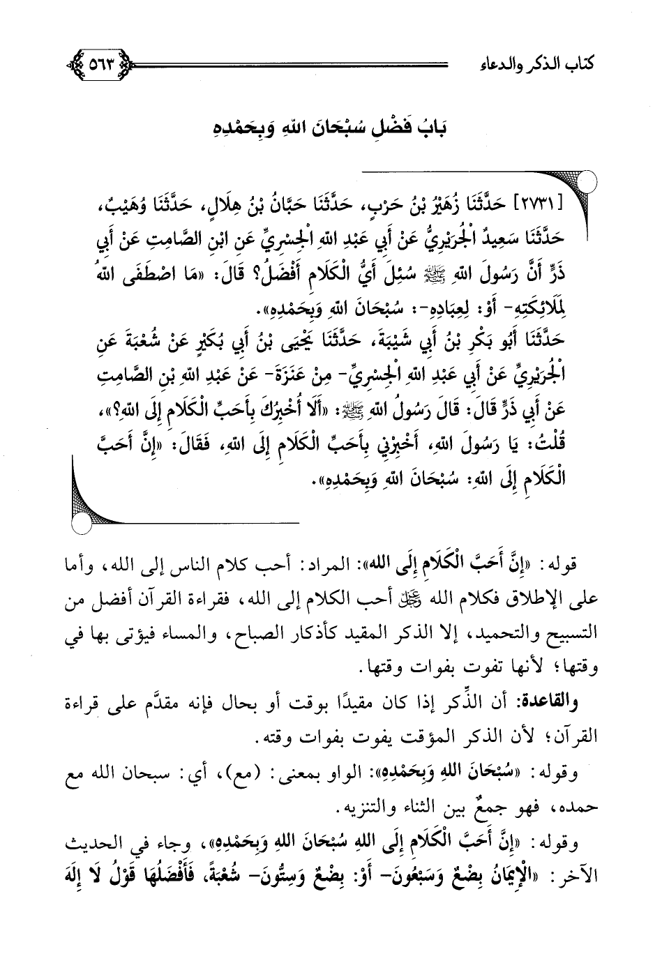 حَدَّثَنَا أَبُو بَكْرِ بْنُ أَبِي شَيْبَةَ، حَدَّثَنَا يَحْيَى ابْنُ أَبِي بُكَيْرٍ عَنْ شُعْبَةَ عَنِ الْجُرَيْرِيِّ عَنْ أَبِي عَبْدِ اللَّهِ الْجِسْرِيِّ- مِنْ عَنَزَةَ- عَنْ عَبْدِ اللَّهِ بْنِ الصَّامِتِ عَنْ أَبِي ذَرٍّ قَالَ: قَالَ رَسُولُ اللَّهِ صلى الله عليه وسلم: ((أَلَا أُخْبِرُكَ بِأَحَبِّ الْكَلَامِ إِلَى اللَّهِ؟ ))، قُلْتُ: يَا رَسُولَ اللَّهِ، أَخْبِرْنِي بِأَحَبِّ الْكَلَامِ إِلَى اللَّهِ، فَقَالَ: ((إِنَّ أَحَبَّ الْكَلَامِ إِلَى اللَّهِ: سُبْحَانَ اللَّهِ وَبِحَمْدِهِ)).