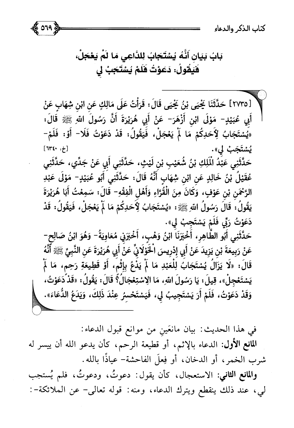 [٢٧٣٥] حَدَّثَنَا يَحْيَى بْنُ يَحْيَى قَالَ: قَرَأْتُ عَلَى مَالِكٍ عَنِ ابْنِ شِهَابٍ عَنْ أَبِي عُبَيْدٍ- مَوْلَى ابْنِ أَزْهَرَ- عَنْ أَبِي هُرَيْرَةَ أَنَّ رَسُولَ اللَّهِ صلى الله عليه وسلم قَالَ: ((يُسْتَجَابُ لِأَحَدِكُمْ مَا لَمْ يَعْجَلْ، فَيَقُولُ: قَدْ دَعَوْتُ فَلَا- أَوْ: فَلَمْ- يُسْتَجَبْ لِي)).