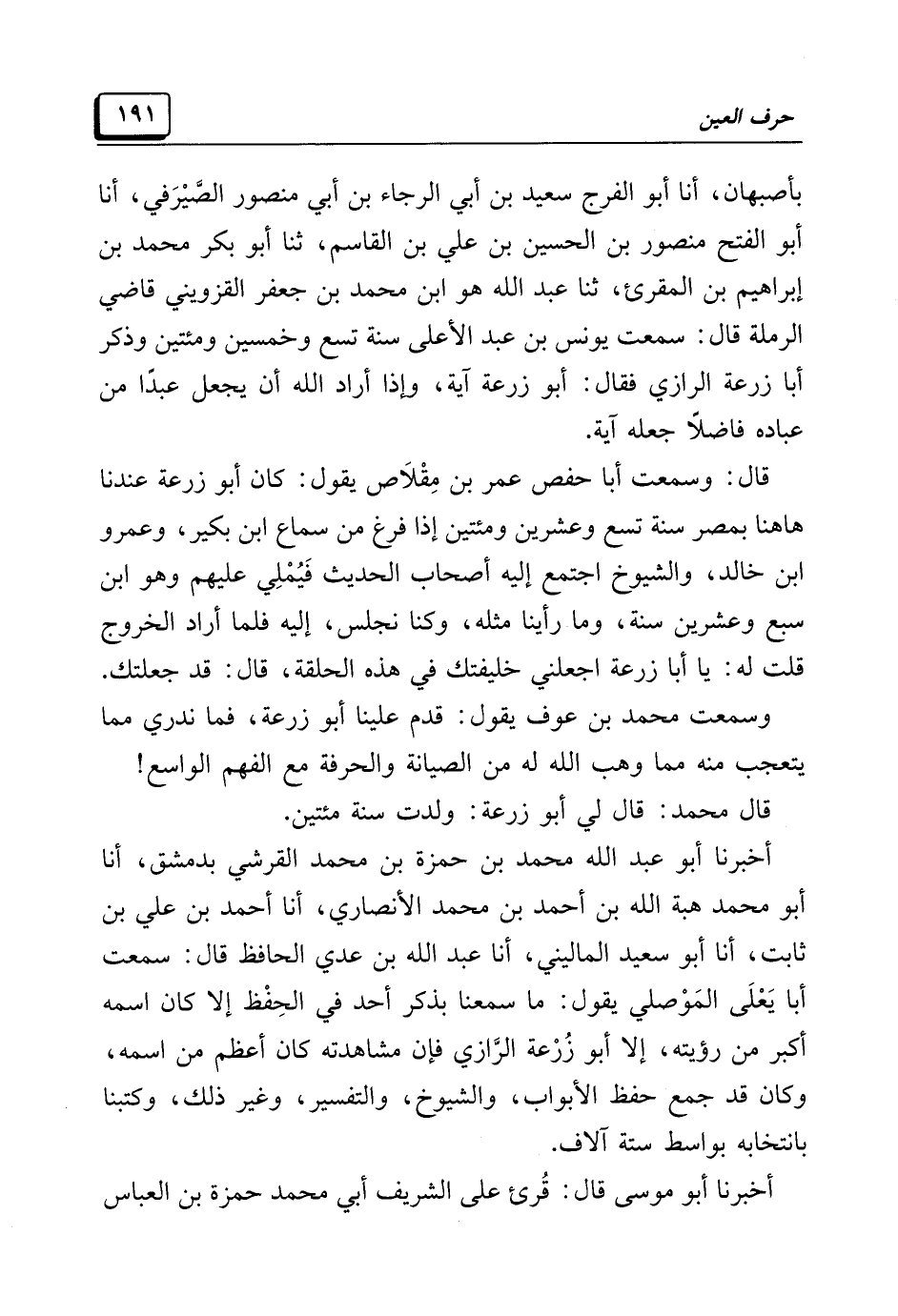 بأصبهان، أنا أبو الفرج سعيد بن أبي الرجاء بن أبي منصور الصَّيْرَفي، أنا أبو الفتح منصور بن الحسين بن علي بن القاسم، ثنا أبو بكر محمد بن إبراهيم بن المقرئ، ثنا عبد الله هو ابن محمد بن جعفر القزويني قاضي الرملة قال: سمعت يونس بن عبد الأعلى سنة تسع وخمسين ومئتين وذكر أبا زرعة الرازي فقال: أبو زرعة آية، وإذا أراد الله أن يجعل عبدًا من عباده فاضلًا جعله آية.