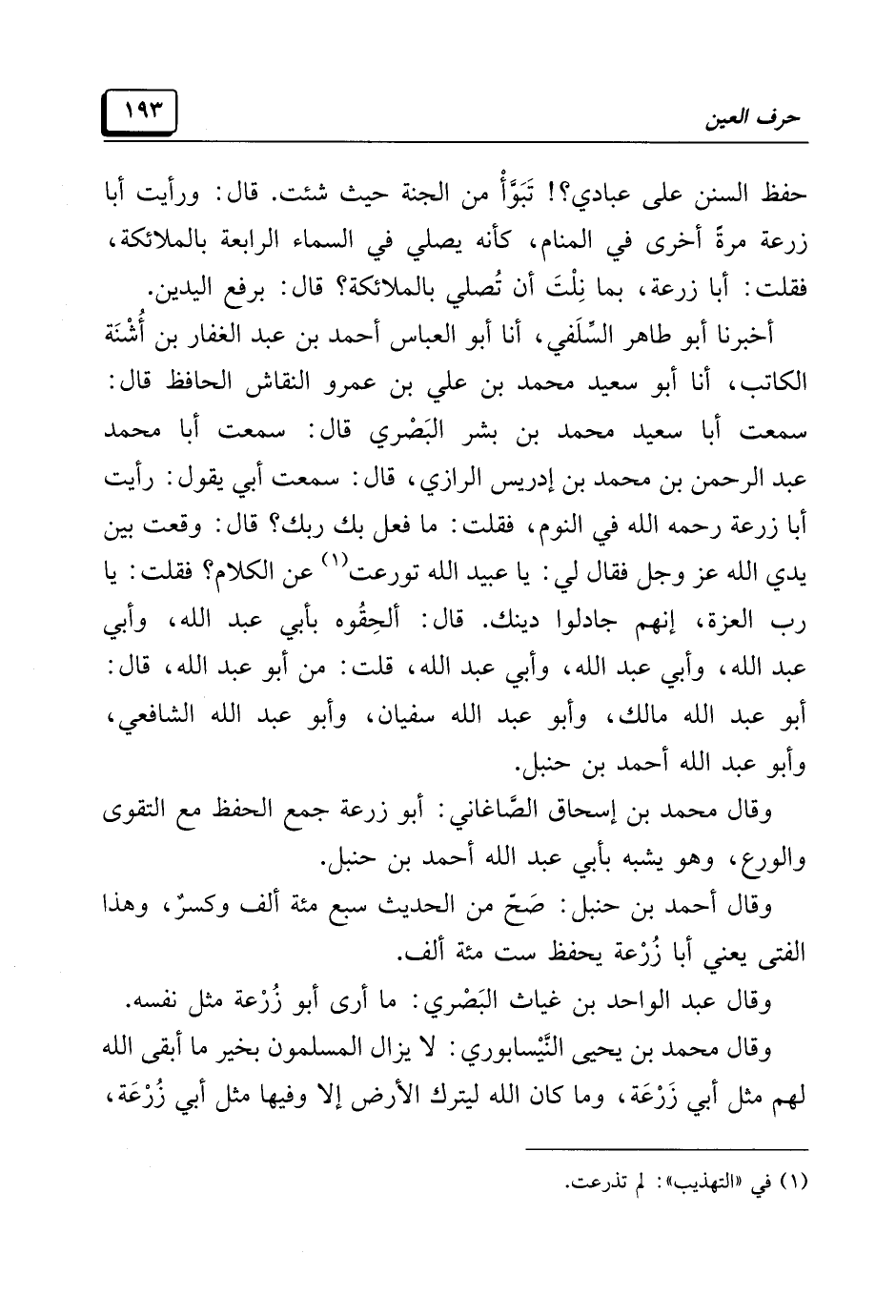 حفظ السنن على عبادي؟ ! تَبَوَّأْ من الجنة حيث شئت. قال: ورأيت أبا زرعة مرةً أخرى في المنام، كأنه يصلي في السماء الرابعة بالملائكة، فقلت: أبا زرعة، بما نِلْتَ أن تُصلي بالملائكة؟ قال: برفع اليدين.