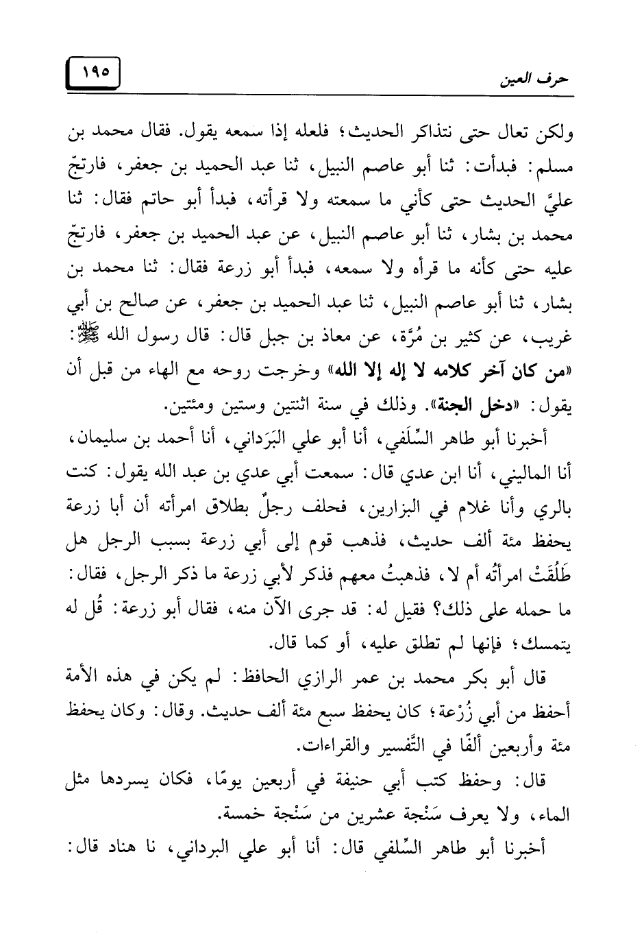 أخبرنا أبو طاهر السِّلَفي، أنا أبو علي البَرَداني، أنا أحمد بن سليمان، أنا الماليني، أنا ابن عدي قال: سمعت أبي عدي بن عبد الله يقول: كنت بالري وأنا غلام في البزارين، فحلف رجلٌ بطلاق امرأته أن أبا زرعة يحفظ مئة ألف حديث، فذهب قوم إلى أبي زرعة بسبب الرجل هل طَلُقَتْ امرأتُه أم لا، فذهبتُ معهم فذكر لأبي زرعة ما ذكر الرجل، فقال: ما حمله على ذلك؟ فقيل له: قد جرى الآن منه، فقال أبو زرعة: قُل له يتمسك؛ فإنها لم تطلق عليه، أو كما قال.