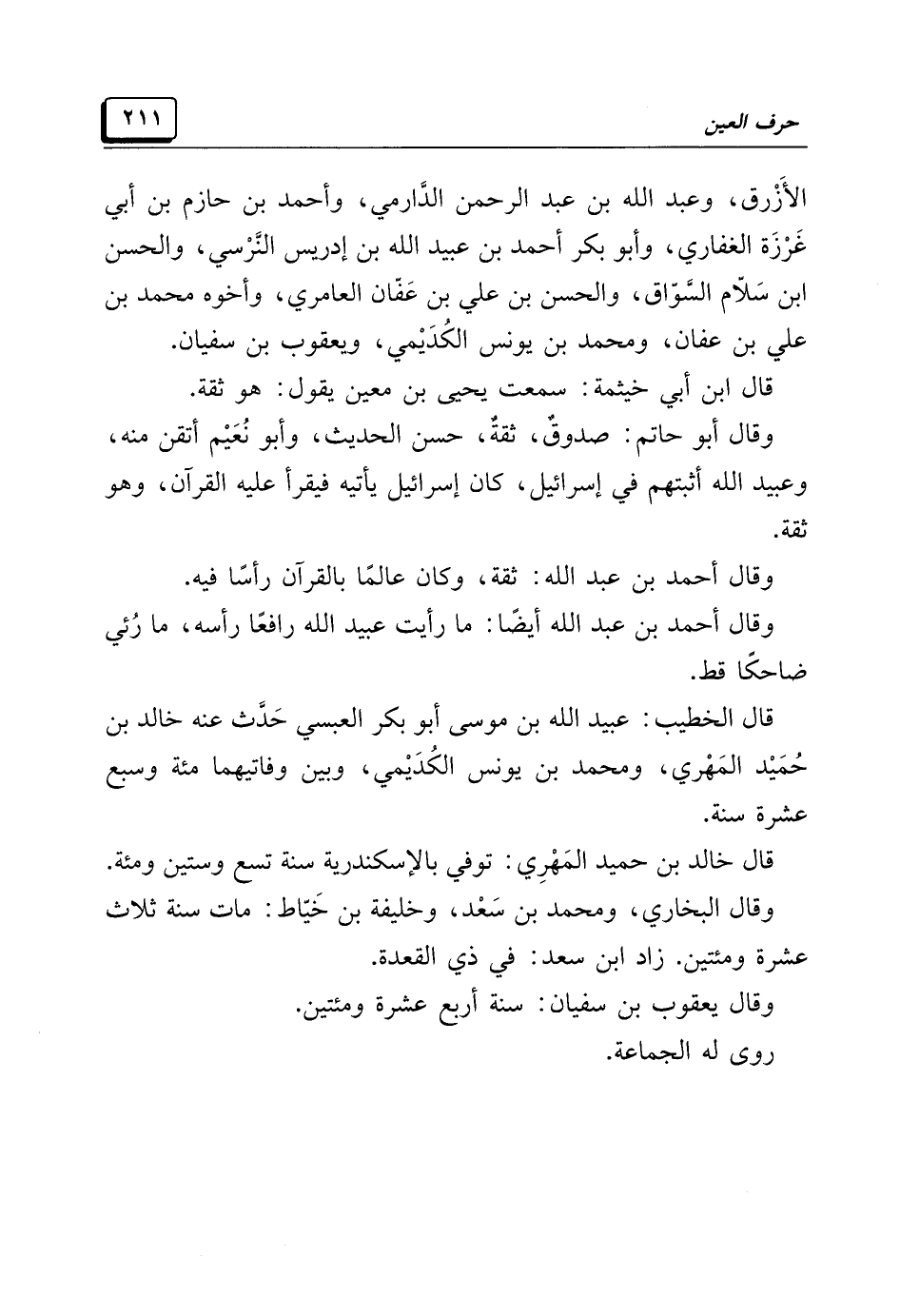 قال الخطيب: عبيد الله بن موسى أبو بكر العبسي حَدَّث عنه خالد بن حُمَيْد المَهْري، ومحمد بن يونس الكُدَيْمي، وبين وفاتيهما مئة وسبع عشرة سنة.