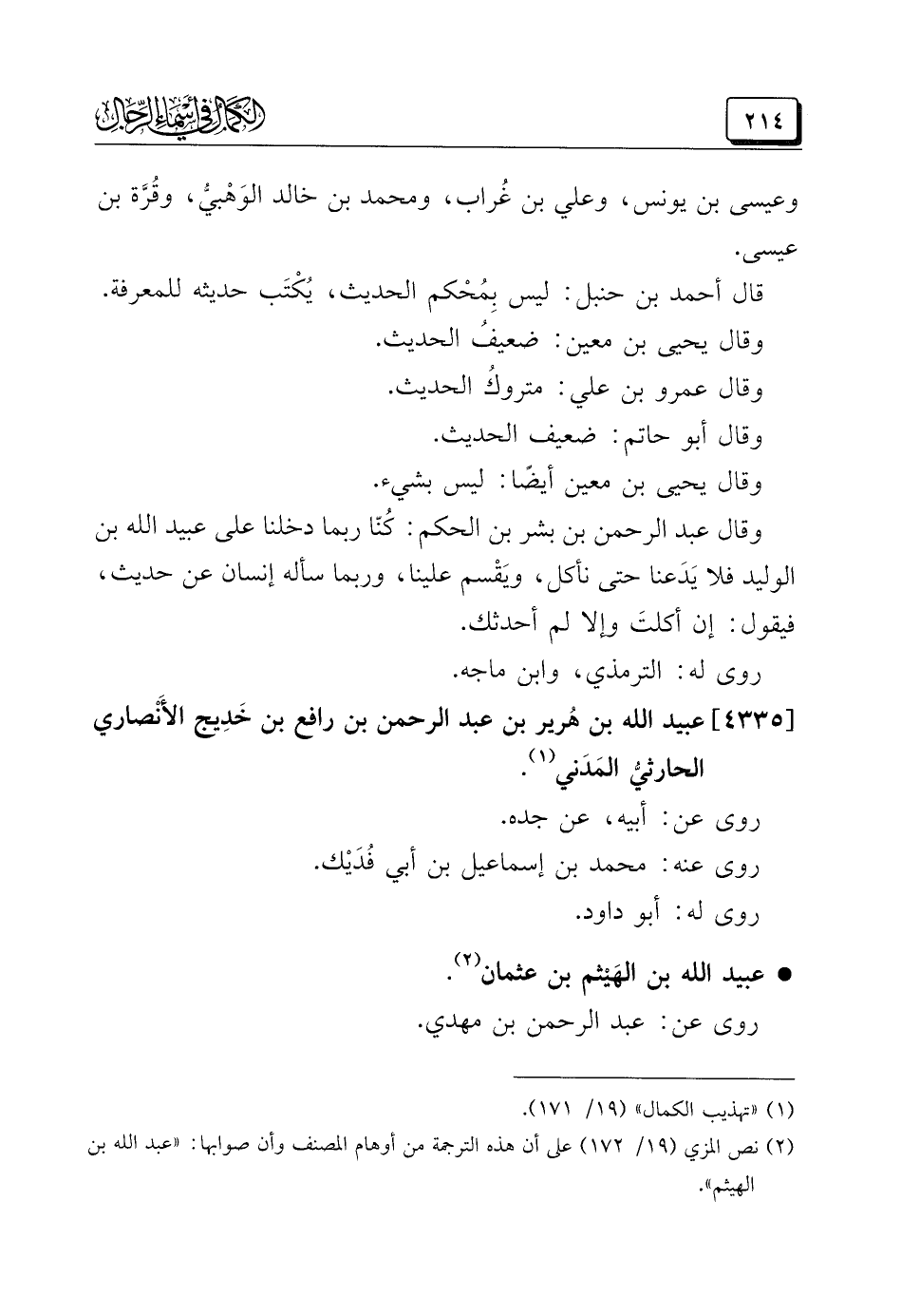 (¬٢) نص المزي (١٩/ ١٧٢) على أن هذه الترجمة من أوهام المصنف وأن صوابها: "عبد الله بن الهيثم".