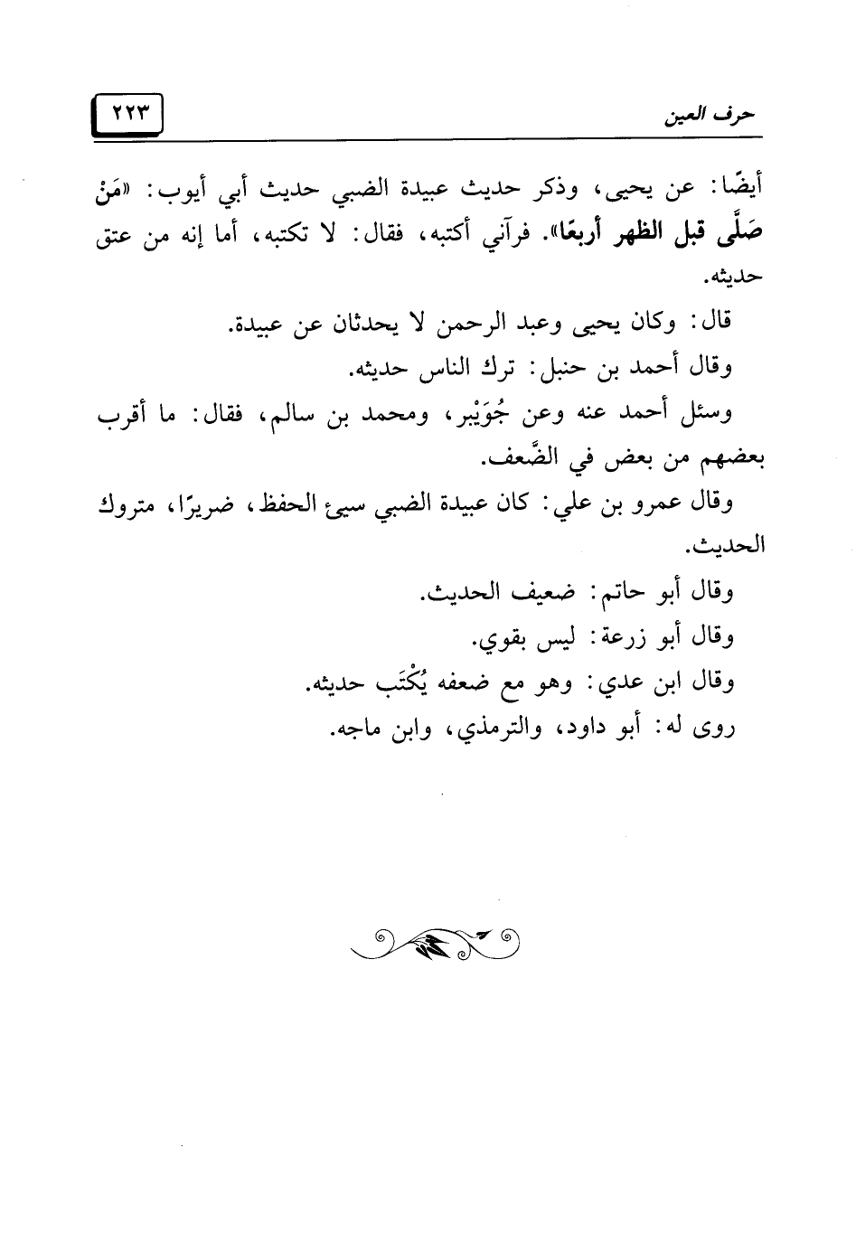 أيضًا: عن يحيى، وذكر حديث عُبَيْدَة الضَّبِّيّ حديث أبي أيوب: "مَنْ صَلَّى قبل الظهر أربعًا". فرآني أكتبه، فقال: لا تكتبه، أمَا إنَّه من عتق حديثه.