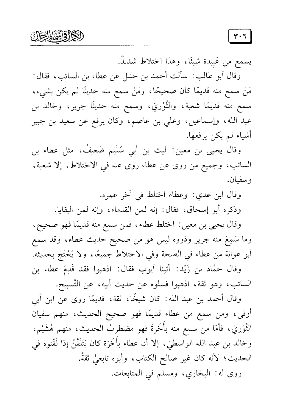 وقال أبو طالب: سألت أحمد بن حنبل عن عطاء بن السائب، فقال: مَنْ سمع منه قديمًا كان صحيحًا، ومَنْ سمع منه حديثًا لم يكن بشيء، سمع منه قديمًا شعبة، والثَّوْريّ، وسمع منه حديثًا جرير، وخالد بن عبد الله، وإسماعيل، وعلي بن عاصم، وكان يرفع عن سعيد بن جبير أشياء لم يكن يرفعها.
