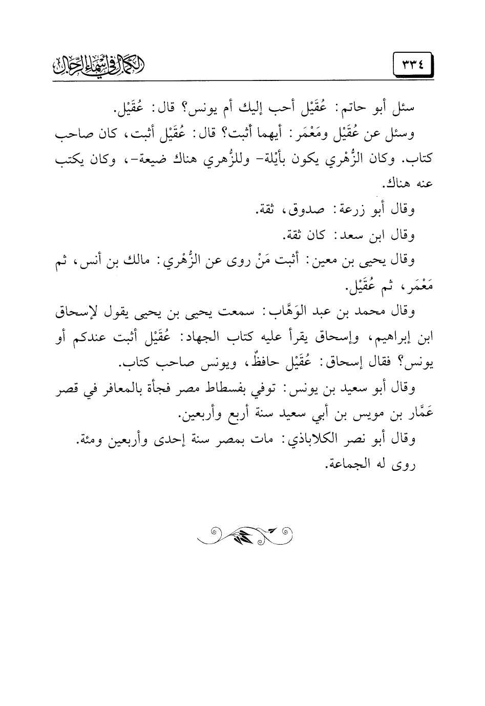سئل أبو حاتم: عُقَيْل أحب إليك أم يونس؟ قال: عُقَيْل.