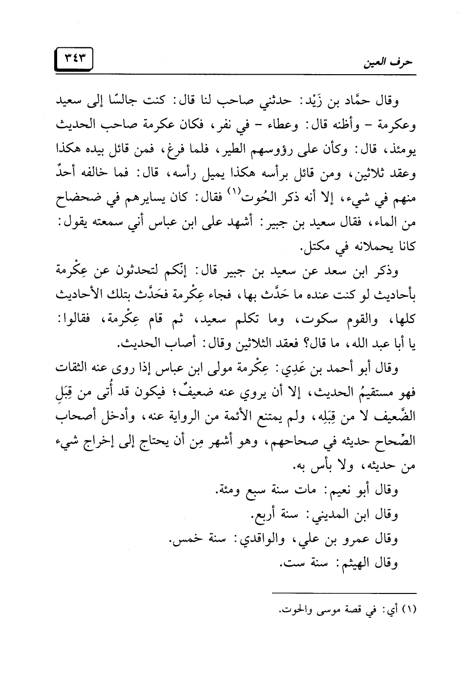 وقال حمَّاد بن زَيْد: حدثني صاحب لنا قال: كنت جالسًا إلى سعيد وعكرمة -وأظنه قال: وعطاء- في نفر، فكان عكرمة صاحب الحديث يومئذ، قال: وكأن على رؤوسهم الطير، فلما فرغ، فمن قائل بيده هكذا وعقد ثلاثين، ومن قائل برأسه هكذا يميل رأسه، قال: فما خالفه أحدٌ منهم في شيء، إلا أنه ذكر الحُوت (¬١) فقال: كان يسايرهم في ضحضاح من الماء، فقال سعيد بن جبير: أشهد على ابن عباس أني سمعته يقول: كانا يحملانه في مكتل.
