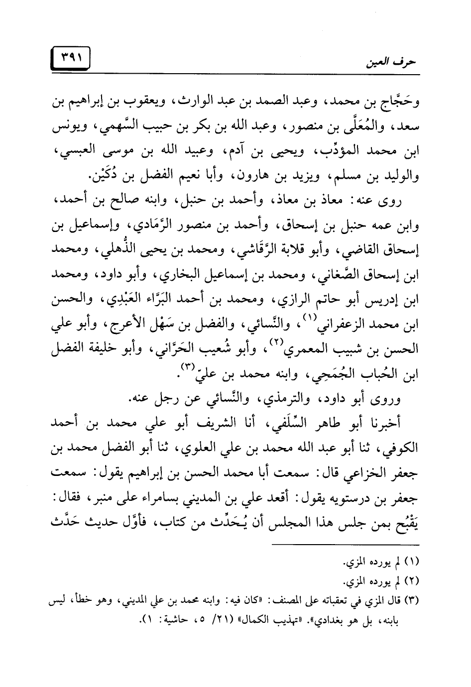 (¬٣) قال المزي في تعقباته على المصنف: "كان فيه: وابنه محمد بن علي المديني، وهو خطأ، ليس بابنه، بل هو بغدادي". "تهذيب الكمال" (٢١/ ٥، حاشية: ١).