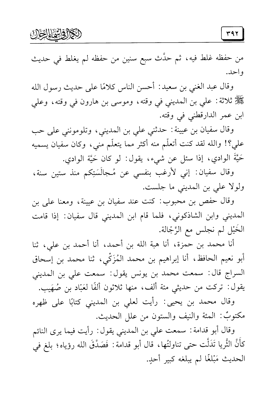 وقال سفيان بن عيينة: حدثني علي بن المديني، وتلومونني على حب علي؟ ! والله لقد كنت أتعلّم منه أكثر مما يتعلّم مني، وكان سفيان يسميه حَيَّةَ الوادي، إذا سئل عن شيء، يقول: لو كان حَيَّة الوادي.