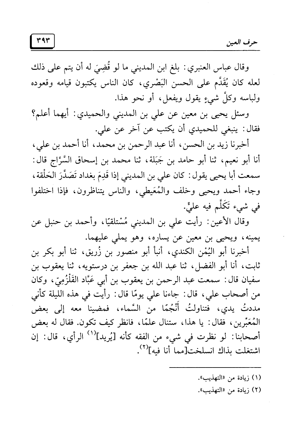 وقال الأعين: رأيت علي بن المديني مُسْتلقيًا، وأحمد بن حنبل عن يمينه، ويحيى بن معين عن يساره، وهو يملي عليهما.