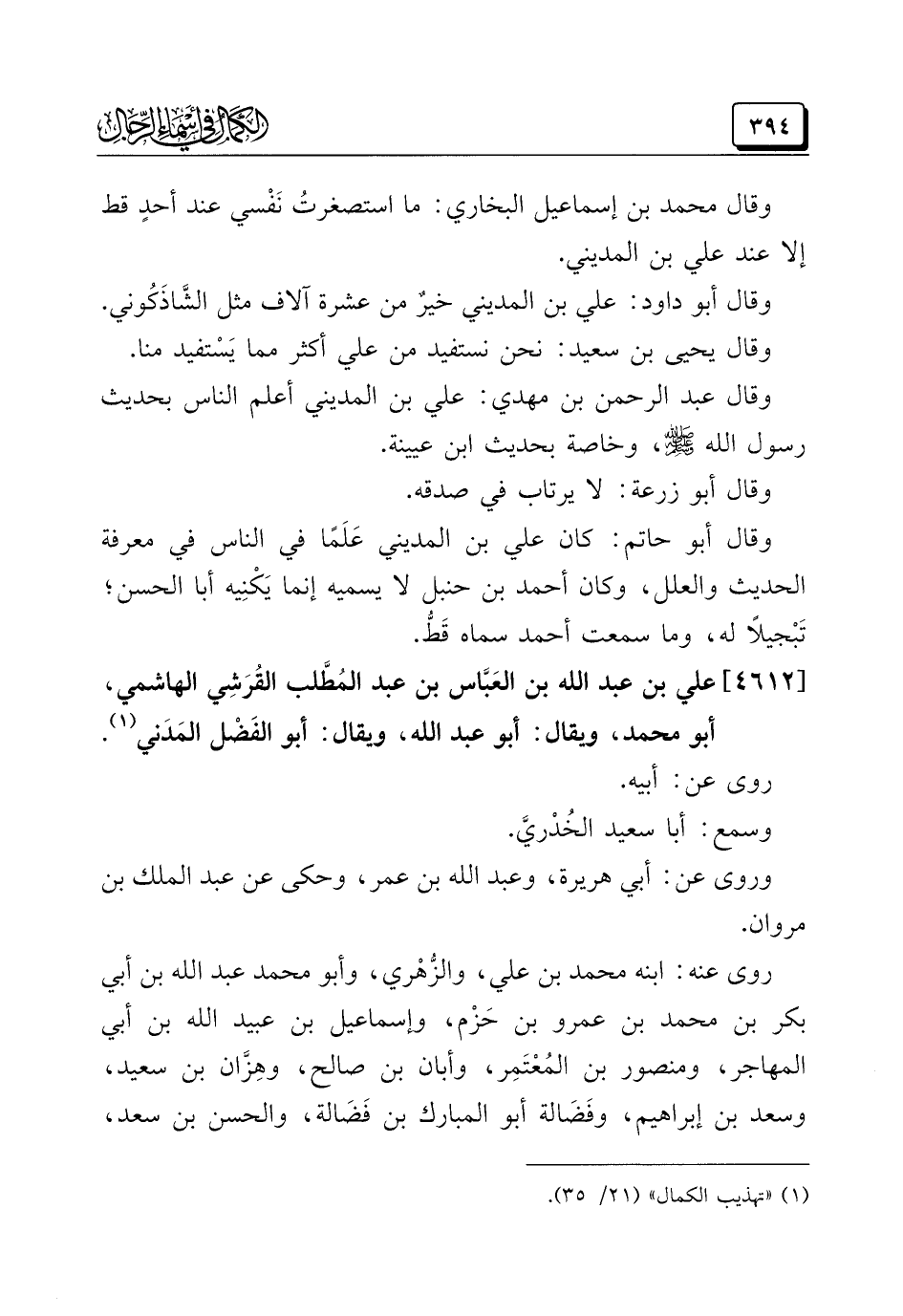 [٤٦١٢] علي بن عبد الله بن العَبَّاس بن عبد المُطَّلب القُرَشِي الهاشمي، أبو محمد، ويقال: أبو عبد الله، ويقال: أبو الفَضْل المَدَني (¬١).