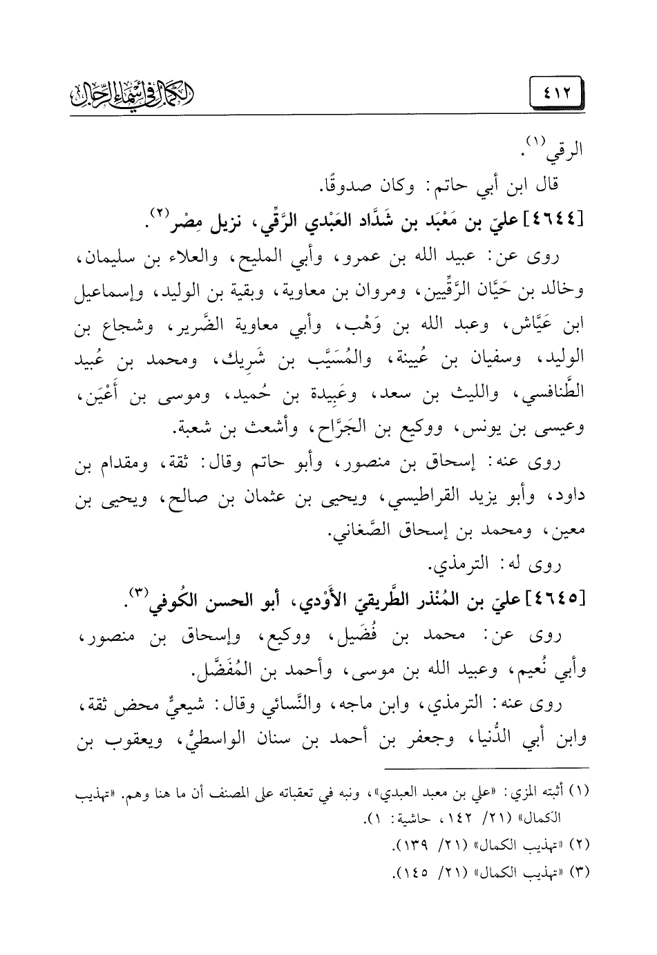 (¬١) أثبته المزي: "علي بن معبد العبدي"، ونبه في تعقباته على المصنف أن ما هنا وهم. "تهذيب الكمال" (٢١/ ١٤٢، حاشية: ١)