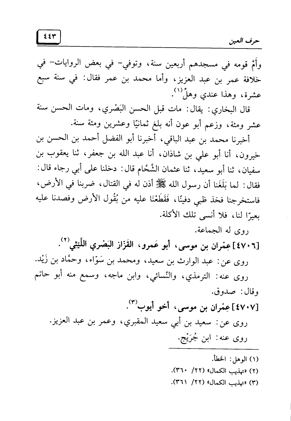 [٤٧٠٦] عِمْران بن موسى، أبو عَمرو، القَزّاز البَصْري اللَّيْثِي (¬٢).