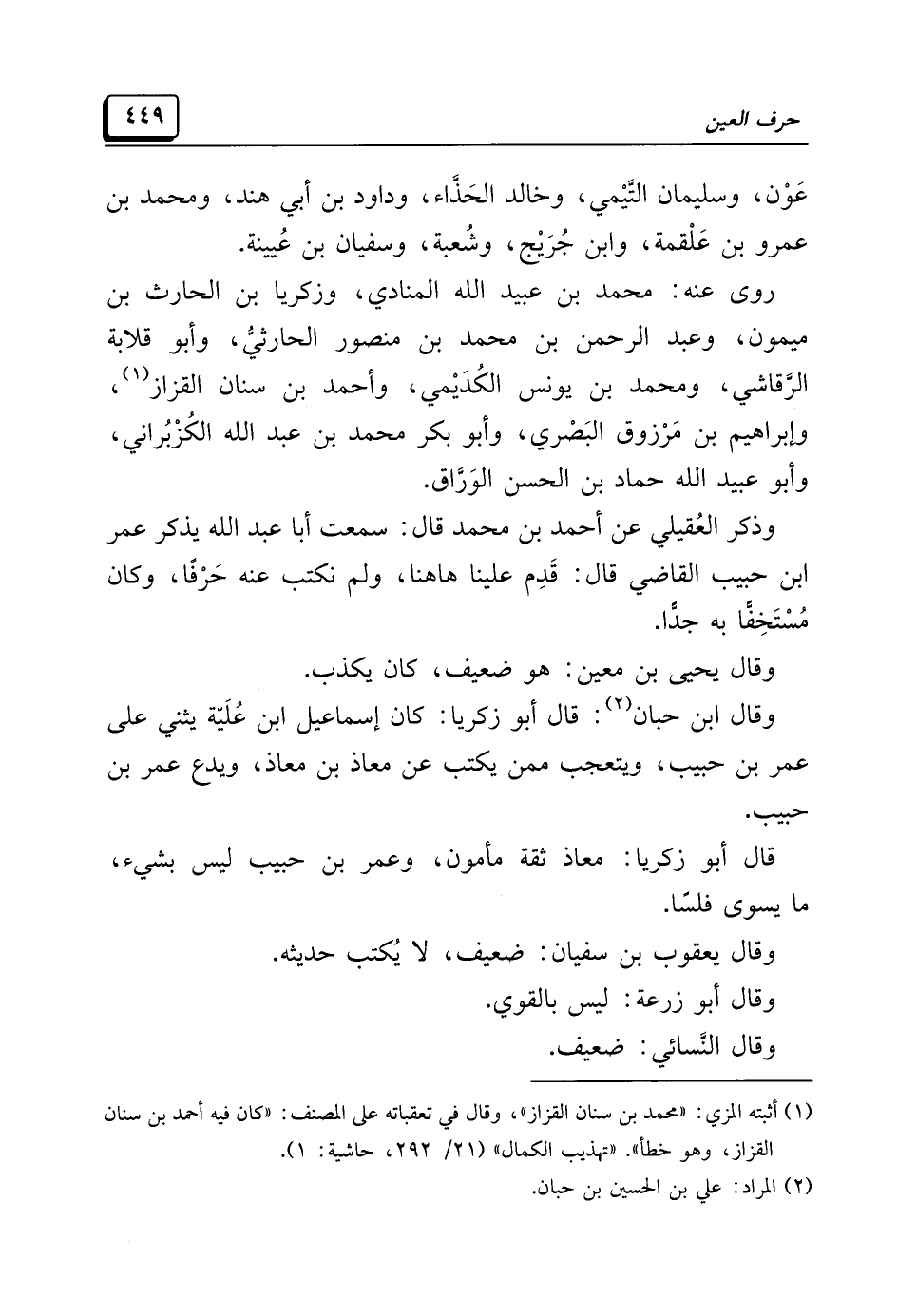 وقال ابن حبان (¬٢): قال أبو زكريا: كان إسماعيل ابن عُلَيّة يثني على عمر بن حبيب، ويتعجب ممن يُكتب عن معاذ بن معاذ، ويدع عمر بن حبيب.