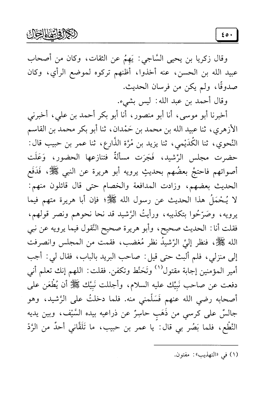 أخبرنا أبو موسى، أنا أبو منصور، أنا أبو بكر أحمد بن علي، أخبرني الأزهري، ثنا عبيد الله بن محمد بن حَمْدان، ثنا أبو بكر محمد بن القاسم النَّحوي، ثنا الكُدَيْمي، ثنا يزيد بن مُرَّة الذَّارع، ثنا عمر بن حبيب قال: حضرت مجلس الرَّشيد، فَجَرَت مسألةٌ فتنازعها الحضور، وَعَلَت أصواتهم فاحتجَّ بعضُهم بحديثٍ يرويه أبو هريرة عن النبي -صَلَّى اللهُ عَلَيْهِ وَسَلَّمَ-، فَدَفَع الحديث بعضهم، وزادت المدافعة والخصام حتى قال قائلون منهم: لا يُحْمَلُ هذا الحديث عن رسول الله -صَلَّى اللهُ عَلَيْهِ وَسَلَّمَ-؛ فإن أبا هريرة متهم فيما يرويه، وصَرّحُوا بتكذيبه، ورأيتُ الرَّشيد قد نحا نحوهم ونصر قولهم، فقلت أنا: الحديث صحيح، وأبو هريرة صحيح النَّقول فيما يرويه عن نبي الله -صَلَّى اللهُ عَلَيْهِ وَسَلَّمَ-، فنظر إليَّ الرَّشيد نظر مُغضب، فقمت من المجلس وانصرفت إلى منزلي، فلم ألبث حتى قيل: صاحب البريد بالباب، فقال لي: أجب أمير المؤمنين إجابة مقتول (¬١) وتَحَنَّط وتكفن. فقلت: اللهم إنك تعلم أني دفعت عن صاحب نَبِيّك عليه السلام، وأجللت نَبِيَّك -صَلَّى اللهُ عَلَيْهِ وَسَلَّمَ- أن يُطْعَن على أصحابه رضي الله عنهم فَسَلّمني منه. فلما دخلتُ على الرَّشيد، وهو جالسٌ على كرسي من ذَهَبٍ حاسِرٌ عن ذراعيه بيده السَّيْف، وبين يديه النَّطْع، فلما بَصُر بي قال: يا عمر بن حبيب، ما تَلَقَّاني أحدٌ من الرَّدّ
