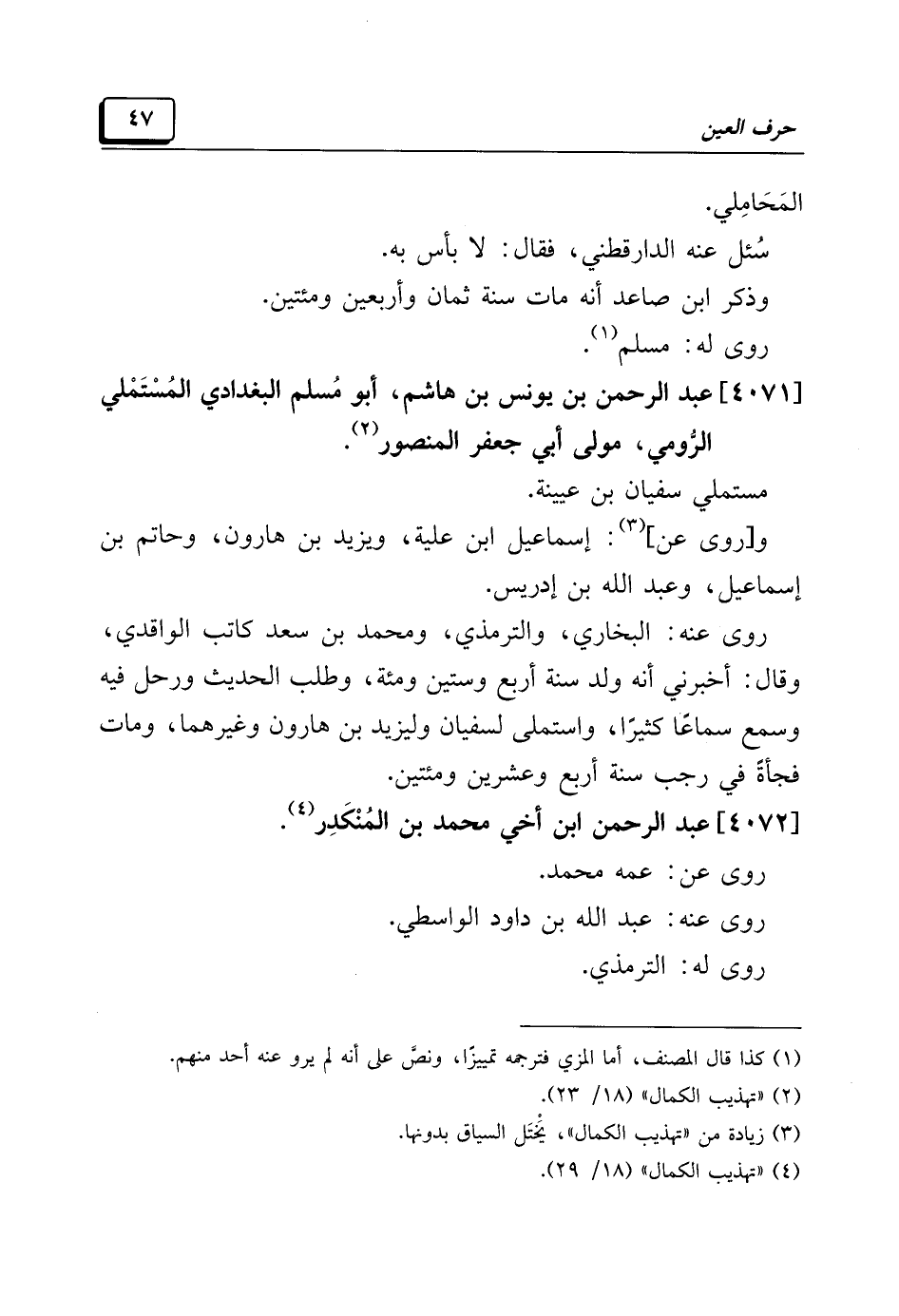 [٤٠٧١] عبد الرحمن ابن يونس ابن هاشم، أبو مُسلم البغدادي المُسْتَمْلي الرُّومي، مولى أبي جعفر المنصور (¬٢).