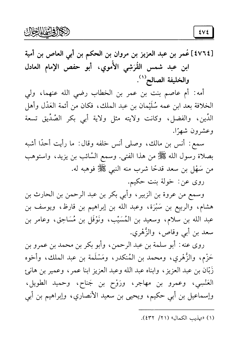 [٤٧٦٤] عُمر بن عبد العزيز بن مروان بن الحكم بن أبي العاص بن أمية ابن عبد شمس القُرَشِي الأُموي، أبو حفص الإمام العادل والخليفة الصالح (¬١).