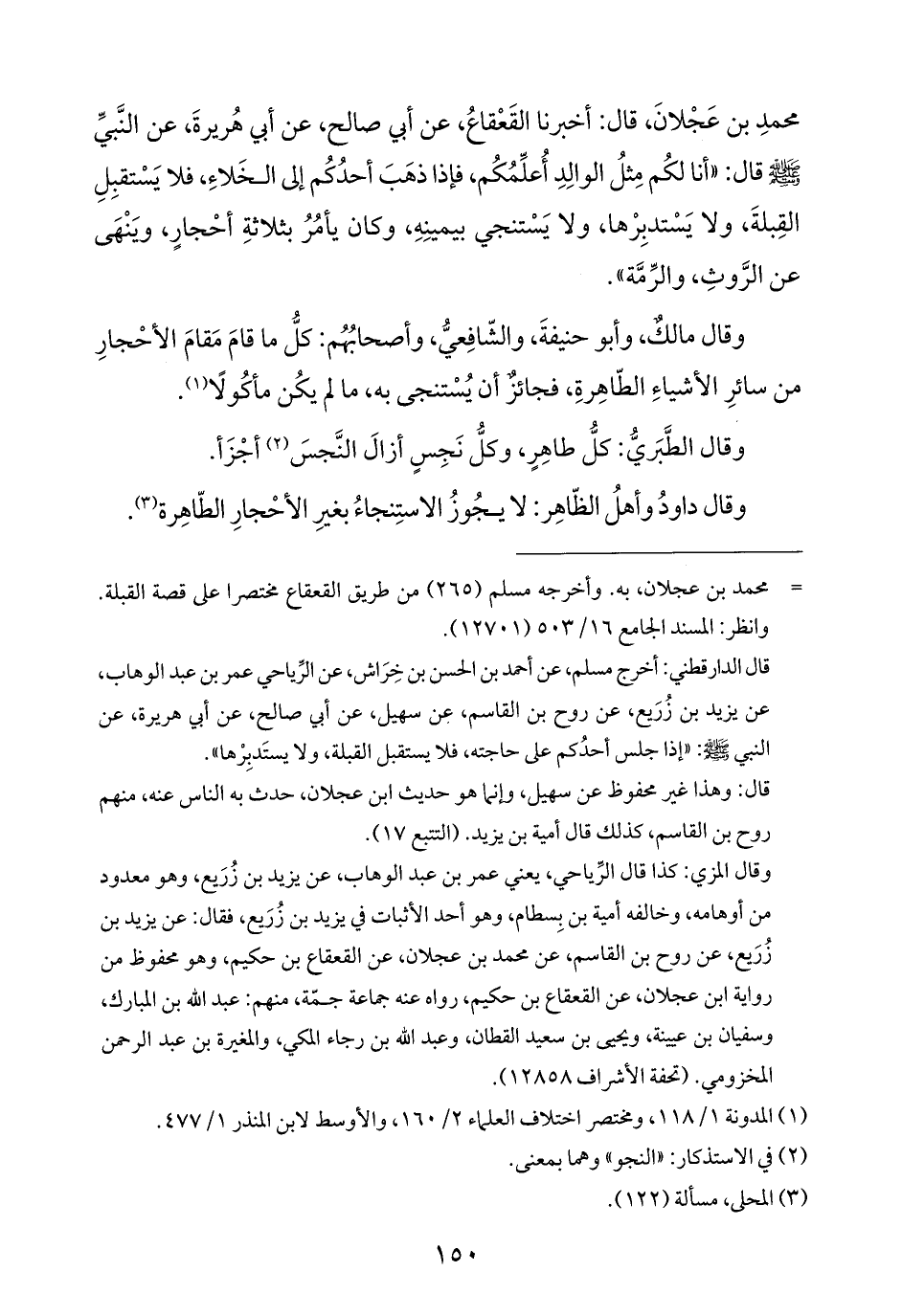 محمدِ بن عَجْلانَ، قال: أخبرنا القَعْقاعُ، عن أبي صالح، عن أبي هُريرةَ، عن النَّبيِّ - صلى الله عليه وسلم - قال: "أنا لكُم مِثلُ الوالِدِ أُعلِّمُكُم، فإذا ذهَبَ أحدُكُم إلى الخَلاءِ، فلا يَسْتقبِلِ القِبلةَ، ولا يَسْتدبِرْها، ولا يَسْتنجي بيمينِهِ، وكان يأمُرُ بثلاثةِ أحْجارٍ، ويَنْهَى عن الرَّوثِ، والرِّمَّة".