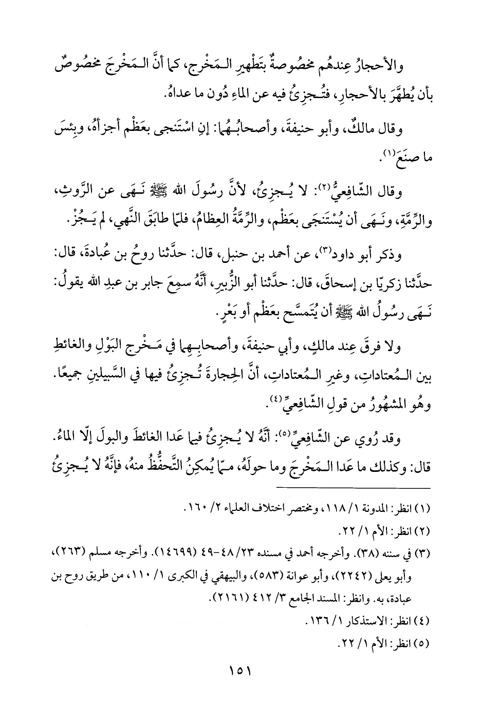 ولا فرقَ عِند مالكٍ، وأبي حنيفةَ، وأصحابِهِما في مَخْرج البَوْلِ والغائطِ بين المُعتاداتِ، وغيرِ المُعتاداتِ، أنَّ الحِجارةَ تُجزِئُ فيها في السَّبيلينِ جميعًا. وهُو المشهُورُ من قولِ الشّافِعيِّ (¬٤).