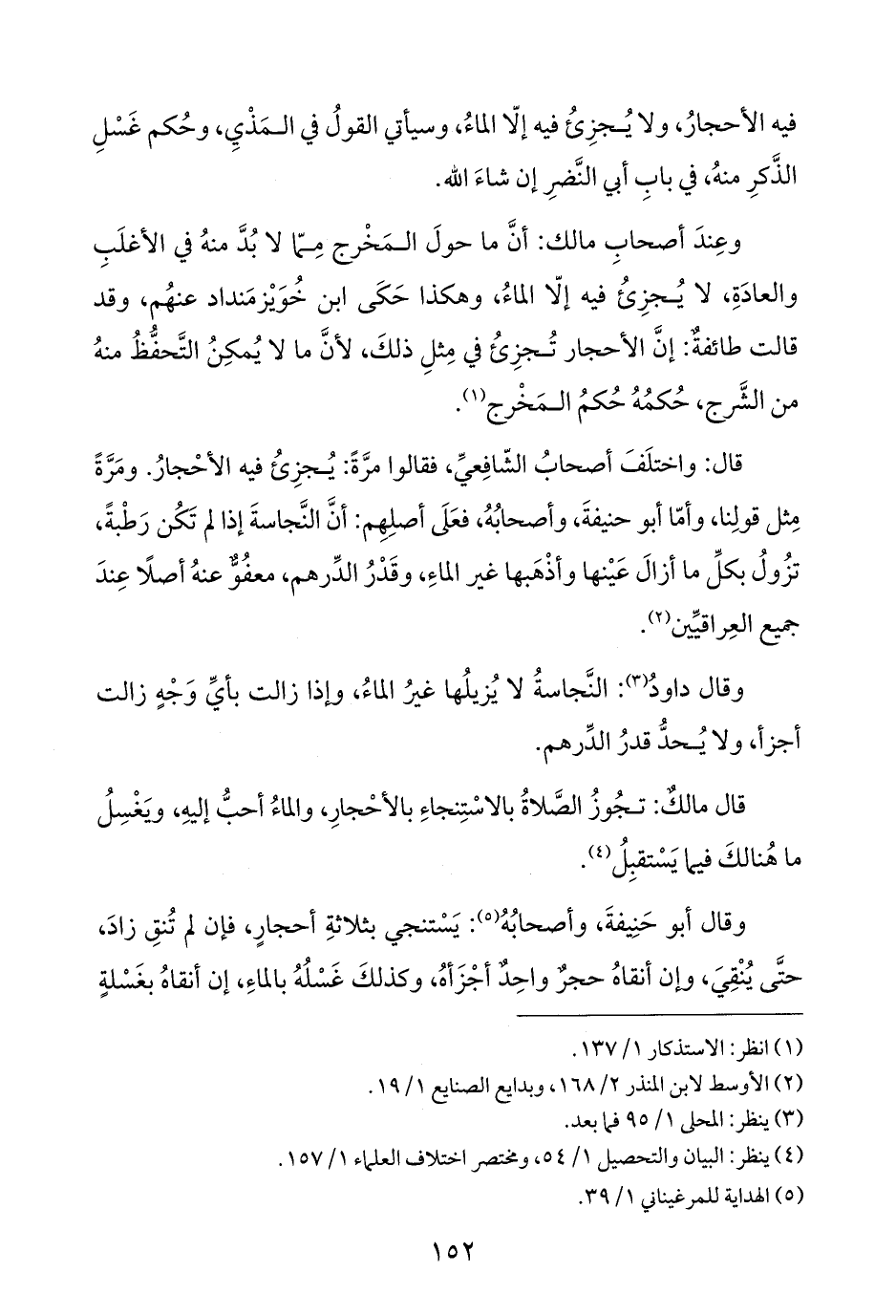قال: واختلَفَ أصحابُ الشّافِعيِّ، فقالوا مرَّةً: يُجزِئُ فيه الأحْجارُ. ومَرَّةً مِثل قولِنا، وأمّا أبو حنيفةَ، وأصحابُهُ، فعَلَى أصلِهِم: أنَّ النَّجاسةَ إذا لم تَكُن رَطْبةً، تزُولُ بكلِّ ما أزالَ عَيْنها وأذْهَبها غير الماءِ، وقَدْرُ الدِّرهم، معفُوٌّ عنهُ أصلًا عِندَ جميع العِراقيِّين (¬٢).