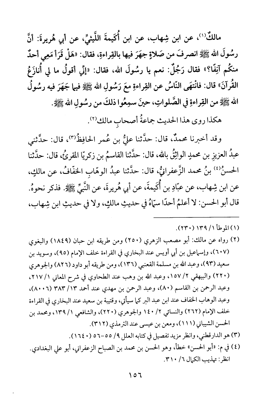 (¬٢) رواه عن مالك: أبو مصعب الزهري (٢٥٠) ومن طريقه ابن حبان (١٨٤٩) والبغوي (٦٠٧)، وإسماعيل بن أبي أويس عند البخاري في القراءة خلف الإمام (٩٥)، وسويد بن سعيد (٩٣)، وعبد الله بن مسلمة القعنبي (١٣٦)، ومن طريقه أبو داود (٨٢٦) والجوهري (٢٢٠) والبيهقي ٢/ ١٥٧، وعبد الله بن وهب عند الطحاوي في شرح المعاني ١/ ٢١٧، وعبد الرحمن بن القاسم (٨٠)، وعبد الرحمن بن مهدي عند أحمد ١٣/ ٣٨٣ (٨٠٠٦)، وعبد الوهاب الخفاف عند ابن عبد البر كما سيأتي، وقتيبة بن سعيد عند البخاري في القراءة خلف الإمام (٢٦٢) والنسائي ٢/ ١٤٠ والجوهري (٢٢٠)، والشافعي ١/ ١٣٩، ومحمد بن الحسن الشيباني (١١١)، ومعن بن عيسى عند الترمذي (٣١٢).