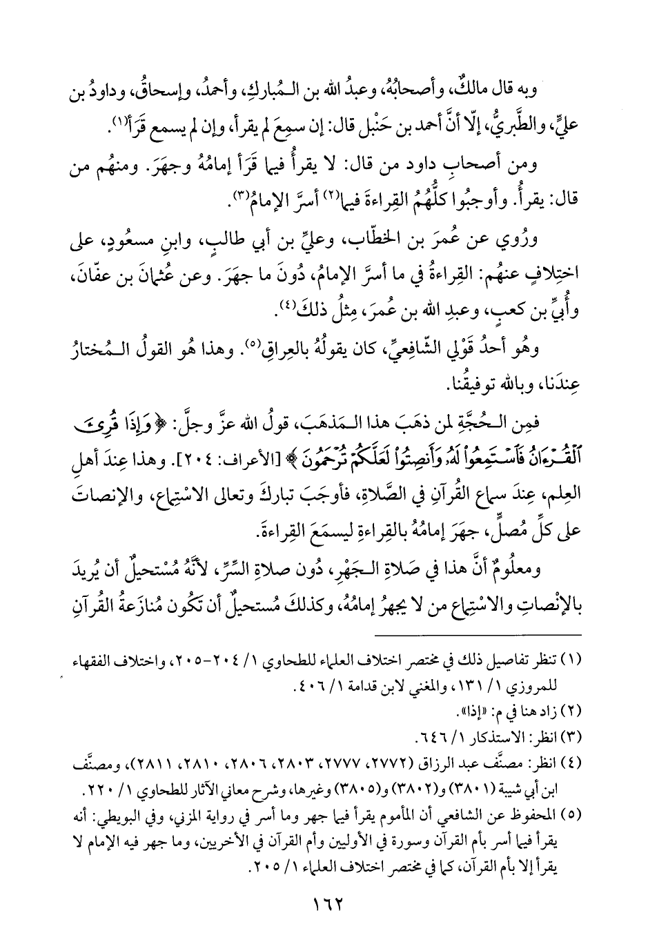 فمِن الحُجَّةِ لمن ذهَبَ هذا المَذهَبَ، قولُ الله عزَّ وجلَّ: {وَإِذَا قُرِئَ الْقُرْآنُ فَاسْتَمِعُوا لَهُ وَأَنْصِتُوا لَعَلَّكُمْ تُرْحَمُونَ} [الأعراف: ٢٠٤]. وهذا عِندَ أهلِ العِلم، عِندَ سماع القُرآنِ في الصلاةِ، فأوجَبَ تباركَ وتعالى الاسْتِماع، والإنصاتَ على كلِّ مُصلٍّ، جهَرَ إمامُهُ بالقِراءةِ ليسمَعَ القِراءةَ.