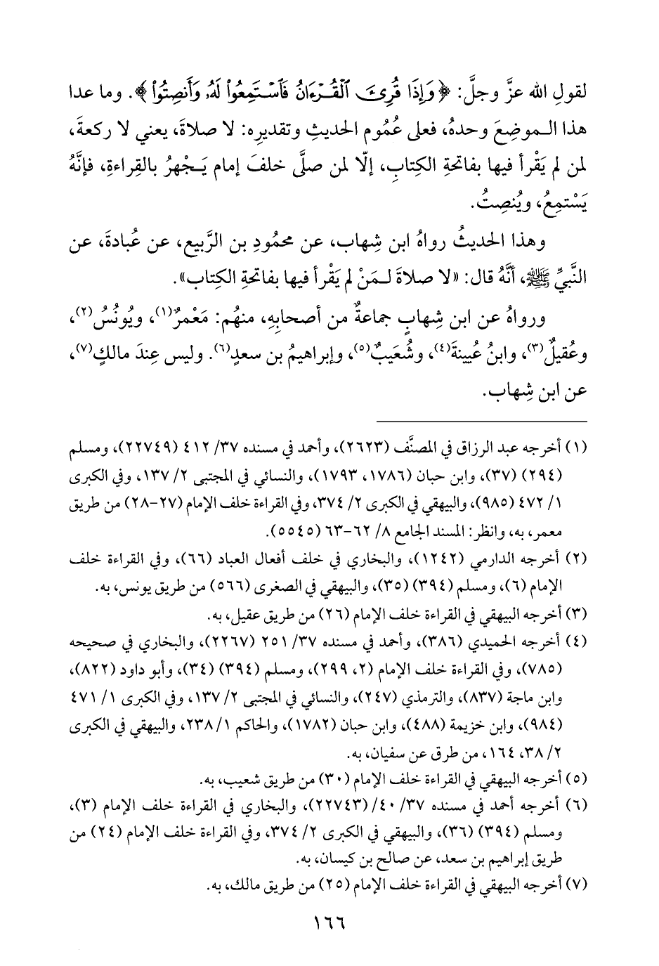 (¬٦) أخرجه أحمد في مسنده ٣٧/ ٤٠/ (٢٢٧٤٣)، والبخاري في القراءة خلف الإمام (٣)، ومسلم (٣٩٤) (٣٦)، والبيهقي في الكبرى ٢/ ٣٧٤، وفي القراءة خلف الإمام (٢٤) من طريق إبراهيم بن سعد، عن صالح بن كيسان، به.