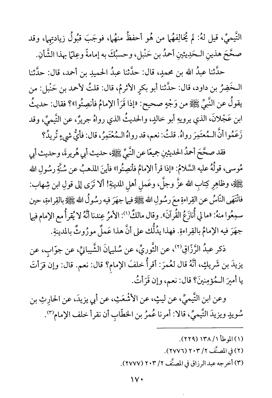 حدَّثنا عبدُ الله بن محمدٍ، قال: حدَّثنا عبدُ الحميدِ بن أحمد، قال: حدَّثنا الخَضِرُ بن داود، قال: حدَّثنا أبو بكرٍ الأثرمُ، قال: قلتُ لأحمد بن حَنْبل: من يقولُ عن النَّبيِّ - صلى الله عليه وسلم - من وَجْهٍ صحيح: "إذا قَرَأ الإمامُ فأنصِتُوا"؟ فقال: حديثُ ابن عَجْلانَ، الذي يرويهِ أبو خالدٍ، والحديثُ الذي رواهُ جريرٌ، عن التَّيميِّ، وقد زَعَمُوا أنَّ المُعتَمِرَ رواهُ. قلتُ: نعم، قد رواهُ المُعْتَمِرُ، قال: فأيُّ شيءٍ تُريدُ؟