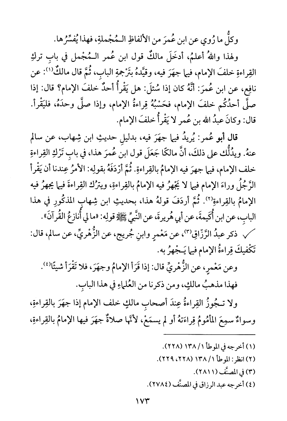 ذكر عبدُ الرَّزّاقِ (¬٣)، عن مَعْمرٍ وابنِ جُريج، عن الزُّهْريِّ، عن سالم، قال: تَكْفيكَ قِراءةُ الإمام فيما يَجْهرُ به.