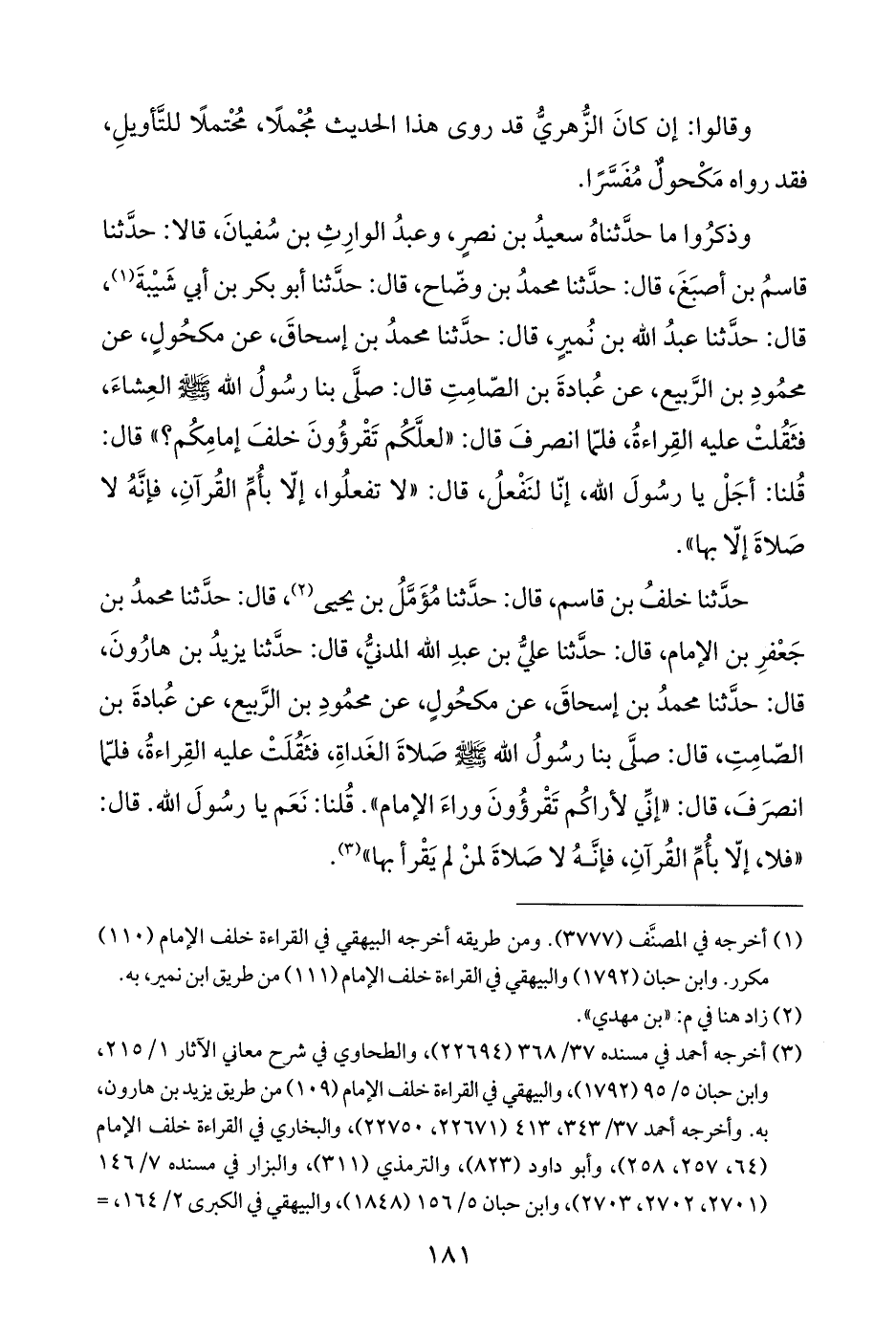 حدَّثنا خلفُ بن قاسم، قال: حدَّثنا مُؤَمَّلُ بن يحيى (¬٢)، قال: حدَّثنا محمدُ بن جَعْفرِ بن الإمام، قال: حدَّثنا عليُّ بن عبدِ الله المدنيُّ، قال: حدَّثنا يزيدُ بن هارُونَ، قال: حدَّثنا محمدُ بن إسحاقَ، عن مكحُولٍ، عن محمُودِ بن الرَّبيع، عن عُبادةَ بن الصّامِتِ، قال: صلَّى بنا رسُولُ الله - صلى الله عليه وسلم - صَلاةَ الغَداةِ، فثَقُلَتْ عليه القِراءةُ، فلمّا انصرَفَ، قال: "إنِّي لأراكُم تَقْرؤُونَ وراءَ الإمام". قُلنا: نَعَم يا رسُولَ الله. قال: "فلا، إلّا بأُمِّ القُرآنِ، فإنَّهُ لا صَلاةَ لمنْ لم يَقْرأ بها" (¬٣).