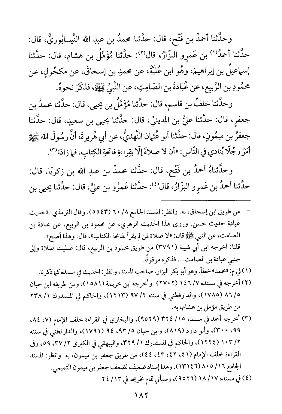 وحدَّثنا خلفُ بن قاسم، قال: حدَّثنا مُؤَمَّلُ بن يحيى، قال: حدَّثنا محمدُ بن جعفرٍ، قال: حدَّثنا عليُّ بن المدينيِّ، قال: حدَّثنا يحيى بن سعيدٍ، قال: حدَّثنا جعفرُ بن ميمُونٍ، قال: حدَّثنا أبو عُثمان النَّهديُّ، عن أبي هُريرةَ، أنَّ رسُولَ الله - صلى الله عليه وسلم - أمَرَ رجُلًا يُنادي في النّاس: "أن لا صلاةَ إلّا بقِراءةِ فاتحةِ الكِتابِ، فما زادَ" (¬٣).