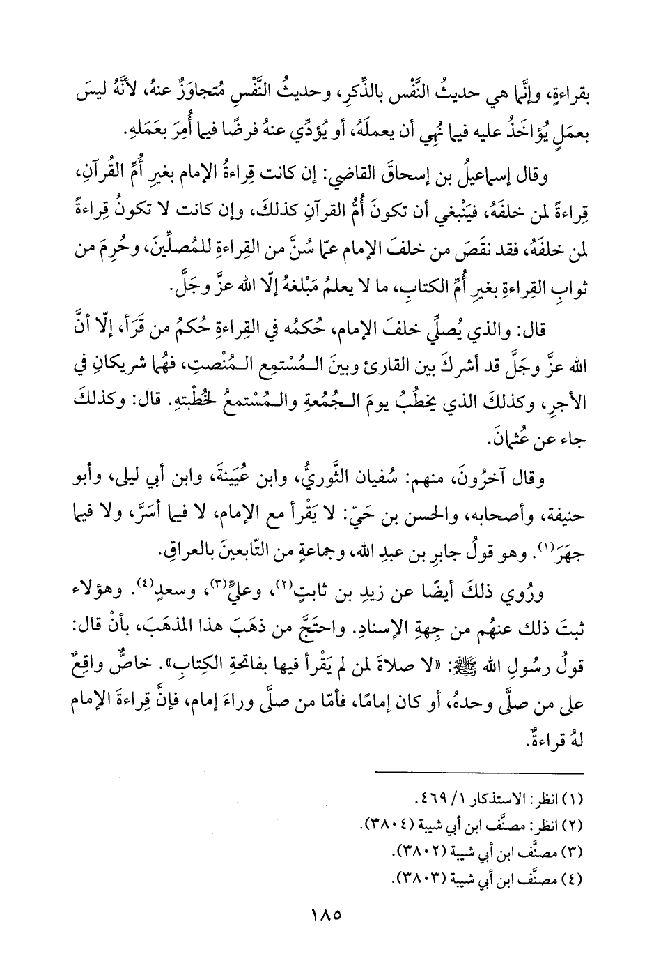 وقال إسماعيلُ بن إسحاقَ القاضي: إن كانت قِراءةُ الإمام بغيرِ أُمِّ القُرآنِ، قِراءةً لمن خلفَهُ، فيَنْبغي أن تكونَ أُمُّ القرآنِ كذلكَ، وإن كانت لا تكونُ قِراءةً لمن خلفَهُ، فقد نقَصَ من خلفَ الإمام عمّا سُنَّ من القِراءةِ للمُصلِّينَ، وحُرِمَ من ثوابِ القِراءةِ بغير أُمِّ الكتابِ، ما لا يعلمُ مَبْلغهُ إلّا الله عزَّ وجَلَّ.