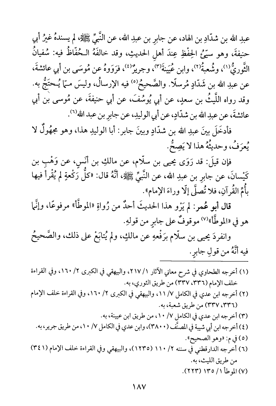 عبدِ الله بن شدّادِ بن الهاد، عن جابرِ بن عبدِ الله، عن النَّبيِّ - صلى الله عليه وسلم -، لم يسندهُ غيرُ أبي حنيفةَ، وهو سيّئُ الحِفْظِ عِندَ أهلِ الحديثِ، وقد خالفَهُ الحُفّاظُ فيه: سُفيانُ الثَّوريُّ (¬١)، وشُعبةُ (¬٢)، وابن عُيَينةَ (¬٣)، وجريرٌ (¬٤)، فرَوَوهُ عن مُوسَى بن أبي عائشةَ، عن عبدِ الله بن شَدّادٍ مُرسلًا. والصَّحيحُ (¬٥) فيه الإرسالُ، وليسَ ممّا يُحتَجُّ به. وقد رواه اللَّيثُ بن سعدٍ، عن أبي يُوسُفَ، عن أبي حنيفةَ، عن مُوسى بن أبي عائشةَ، عن عبدِ الله بن شدّادٍ، عن أبي الوليدِ، عن جابرِ بن عبد الله (¬٦).
