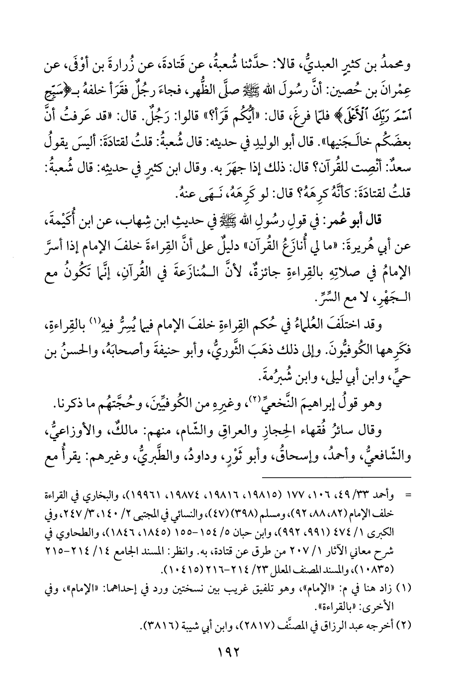 ومحمدُ بن كثيرٍ العبديُّ، قالا: حدَّثنا شُعبةُ، عن قَتادةَ، عن زُرارةَ بن أوْفَى، عن عِمْرانَ بن حُصين: أنَّ رسُولَ الله - صلى الله عليه وسلم - صلَّى الظُّهر، فجاءَ رجُل فقَرَأ خلفهُ بـ {سَبِّحِ اسْمَ رَبِّكَ الْأَعْلَى} فلمّا فرغَ، قال: "أيُّكُم قَرَأ؟ " قالوا: رَجُلٌ. قال: "قد عَرفتُ أنَّ بعضَكُم خالَجَنيها". قال أبو الوليدِ في حديثه: قال شُعبةُ: قلتُ لقتادَةَ: أليسَ يقولُ سعدٌ: أنْصِت للقُرآن؟ قال: ذلك إذا جهَرَ به. وقال ابن كئيرٍ في حديثه: قال شُعبةُ: قلتُ لقتادَةَ: كأنَّهُ كرِهَهُ؟ قال: لو كَرِهَهُ، نَهَى عنهُ.