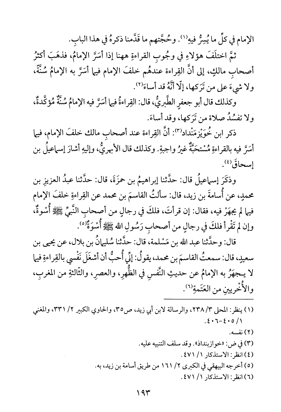 قال: وحدَّثنا عبد الله بن مَسْلمة، قال: حدَّثنا سُليمانُ بن بلال، عن يحيى بن سعيدٍ، قال: سمعتُ القاسمَ بن محمد، يقولُ: إنِّي أُحبُّ أن أشغَلَ نَفْسي بالقِراءةِ فيما لا يجهَرُ به الإمامُ عن حديثِ النَّفسِ في الظُّهرِ، والعصرِ، والثّالثةِ من المغربِ، والأُخْريينِ من العَتَمةِ (¬٦).
