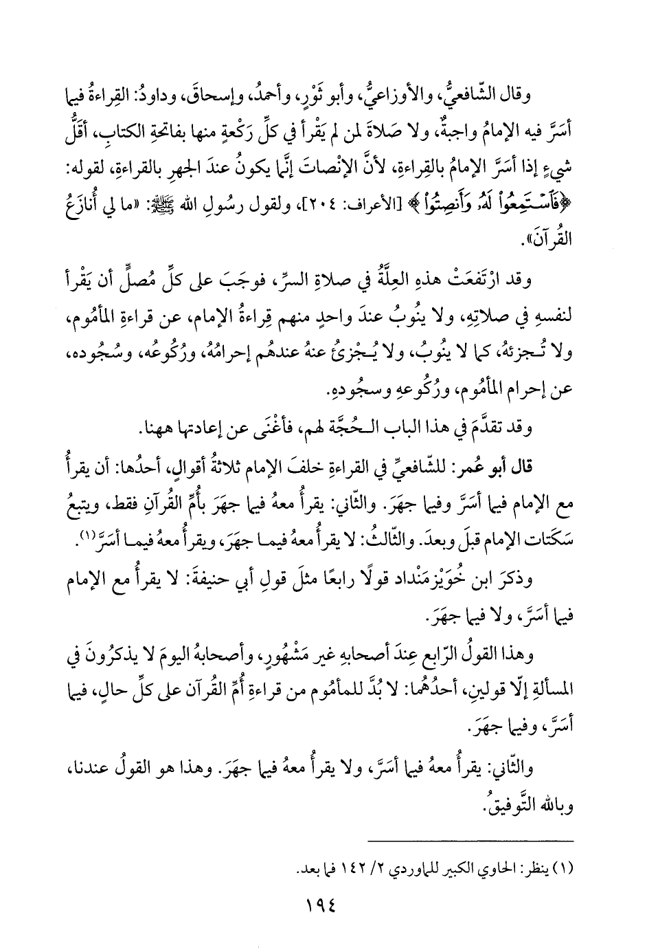 وقال الشّافعيُّ، والأوزاعيُّ، وأبو ثَوْرٍ، وأحمدُ، وإسحاقَ، وداودُ: القِراءةُ فيما أسَرَّ فيه الإمامُ واجبةٌ، ولا صَلاةَ لمن لم يَقْرأ في كلِّ رَكْعةٍ منها بفاتحةِ الكتابِ، أقَلُّ شيءٍ إذا أسَرَّ الإمامُ بالقِراءةِ، لأنَّ الإنْصاتَ إنَّما يكونُ عندَ الجهرِ بالقراءةِ، لقوله: {فَاسْتَمِعُوا لَهُ وَأَنْصِتُوا} [الأعراف: ٢٠٤]، ولقول رسُولِ الله - صلى الله عليه وسلم -: "ما لي أُنازَعُ القُرآنَ".