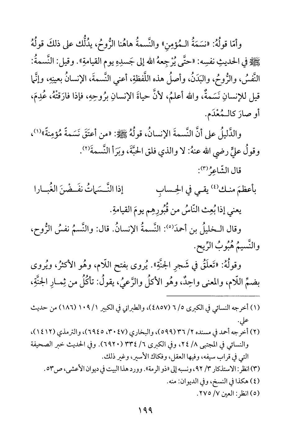 وأمّا قولُهُ: "نسَمَةُ المُؤمِنِ" والنَّسمةُ هاهُنا الرُّوحُ، يدُلُّك على ذلكَ قولُهُ - صلى الله عليه وسلم - في الحديثِ نفسِه: "حتَّى يُرْجِعهُ الله إلى جَسدِهِ يوم القيامةِ". وقيل: النَّسمةُ: النَّفسُ، والرُّوحُ، والبَدَنُ، وأصلُ هذه اللَّفظةِ، أعني النَّسمةَ، الإنسانُ بعينِهِ، وإنَّما قيل للإنسانِ نَسَمةٌ، والله أعلمُ، لأنَّ حياةَ الإنسانِ برُوحِهِ، فإذا فارَقتْهُ، عُدِمَ، أو صارَ كالمُعْدَم.