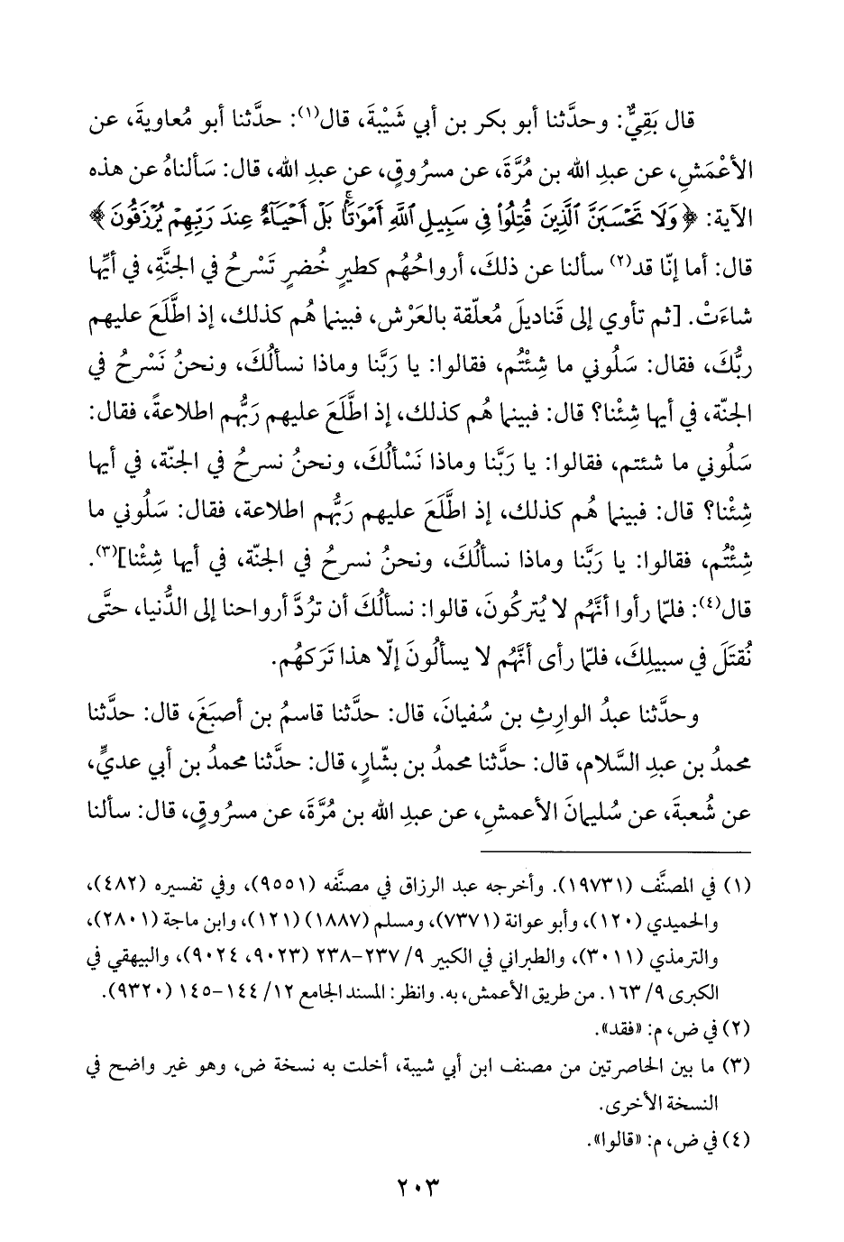 قال بَقِيٌّ: وحدَّثنا أبو بكر بن أبي شَيْبةَ، قال (¬١): حدَّثنا أبو مُعاويةَ، عن الأعْمَشِ، عن عبدِ الله بن مُرَّةَ، عن مسرُوقٍ، عن عبدِ الله، قال: سَألناهُ عن هذه الآية: {وَلَا تَحْسَبَنَّ الَّذِينَ قُتِلُوا فِي سَبِيلِ اللَّهِ أَمْوَاتًا بَلْ أَحْيَاءٌ عِنْدَ رَبِّهِمْ يُرْزَقُونَ} قال: أما إنّا قد (¬٢) سألنا عن ذلكَ، أرواحُهُم كطيرٍ خُضرٍ تَسْرحُ في الجنَّةِ، في أيِّها شاءَتْ. [ثم تأوي إلى قَناديلَ مُعلّقة بالعَرْش، فبينما هُم كذلك، إذ اطَّلَعَ عليهم ربُّكَ، فقال: سَلُوني ما شِئْتُم، فقالوا: يا رَبَّنا وماذا نسألُكَ، ونحنُ نَسْرحُ في الجنّة، في أيها شِئْنا؟ قال: فبينما هُم كذلك، إذ اطَّلَعَ عليهم رَبُّهم اطلاعةً، فقال: سَلُوني ما شئتم، فقالوا: يا رَبَّنا وماذا نَسْألُكَ، ونحنُ نسرحُ في الجنّة، في أيها شِئْنا؟ قال: فبينما هُم كذلك، إذ اطَّلَعَ عليهم رَبُّهم اطلاعة، فقال: سَلُوني ما شِئْتُم، فقالوا: يا رَبَّنا وماذا نسألُكَ، ونحنُ نسرحُ في الجنّة، في أيها شِئْنا] (¬٣). قال (¬٤): فلمّا رأوا أنَّهُم لا يُتركُونَ، قالوا: نسألُكَ أن ترُدَّ أرواحنا إلى الدُّنيا، حتَّى نُقتَلَ في سبيلِكَ، فلمّا رأى أنَّهُم لا يسألُونَ إلّا هذا تَرَكهُم.
