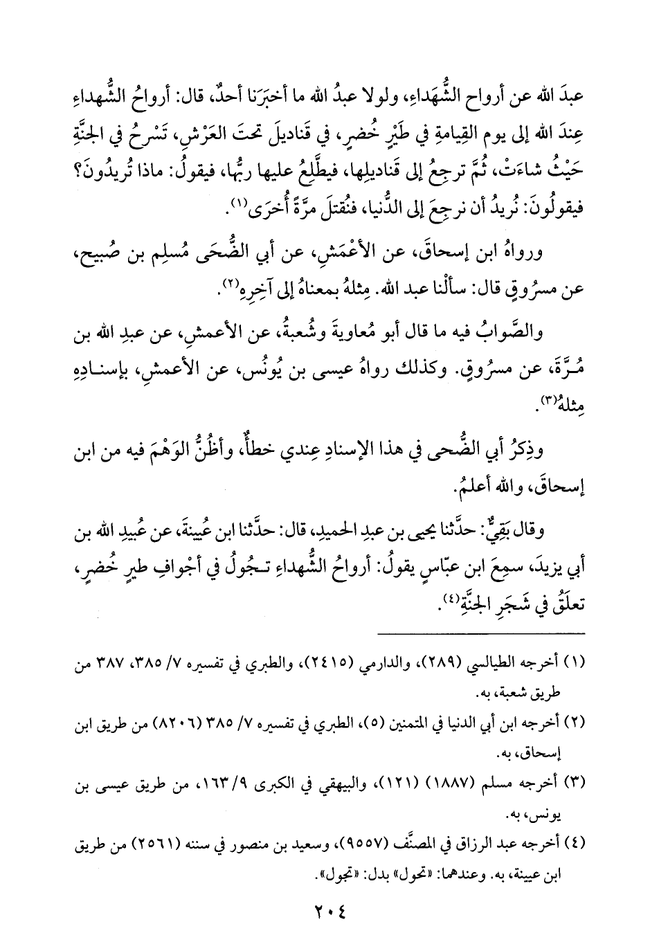 عبدَ الله عن أرواح الشُّهَداءِ، ولولا عبدُ الله ما أخبَرَنا أحدٌ، قال: أرواحُ الشُّهداءِ عِندَ الله إلى يوم القِيامةِ في طَيْرٍ خُضرٍ، في قَناديلَ تحتَ العَرْشِ، تَسْرحُ في الجنَّةِ حَيْثُ شاءَتْ، ثُمَّ ترجِعُ إلى قَناديلِها، فيطَّلِعُ عليها ربُّها، فيقولُ: ماذا تُريدُونَ؟ فيقولُونَ: نُريدُ أن نرجِعَ إلى الدُّنيا، فنُقتلَ مرَّةً أُخرَى (¬١).