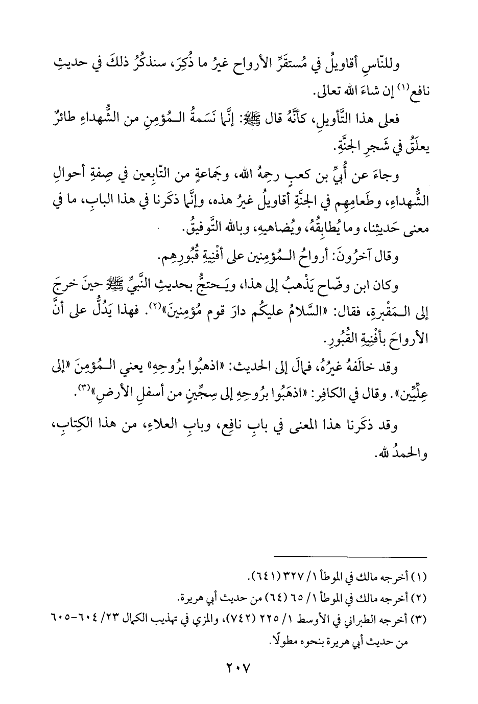 وجاءَ عن أُبيِّ بن كعبٍ رحِمهُ الله، وجَماعةٍ من التّابِعين في صِفةِ أحوالِ الشُّهداءِ، وطَعامِهِم في الجنَّةِ أقاويلُ غيرُ هذه، وإنَّما ذكَرنا في هذا البابِ، ما في معنى حَديثِنا، وما يُطابِقُهُ، ويُضاهيهِ، وبالله التَّوفيقُ.