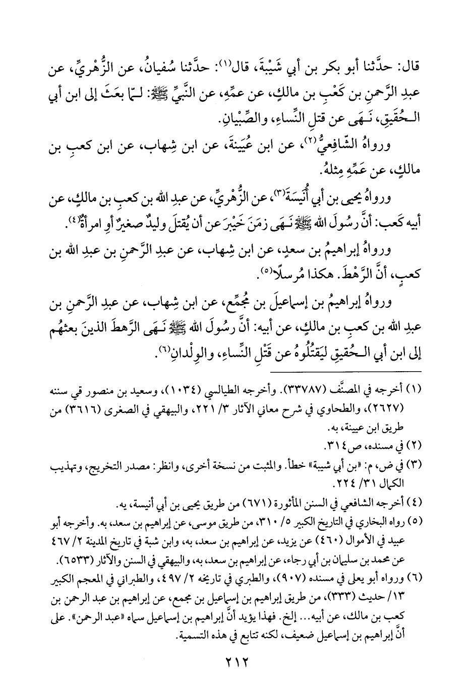 قال: حدَّثنا أبو بكر بن أبي شَيْبةَ، قال (¬١): حدَّثنا سُفيانُ، عن الزُّهْريِّ، عن عبدِ الرَّحمنِ بن كَعْبِ بن مالكٍ، عن عمِّهِ، عن النَّبيِّ - صلى الله عليه وسلم -: لمّا بعَثَ إلى ابن أبي الحُقَيقِ، نَهَى عن قتلِ النِّساءِ، والصِّبْيانِ.