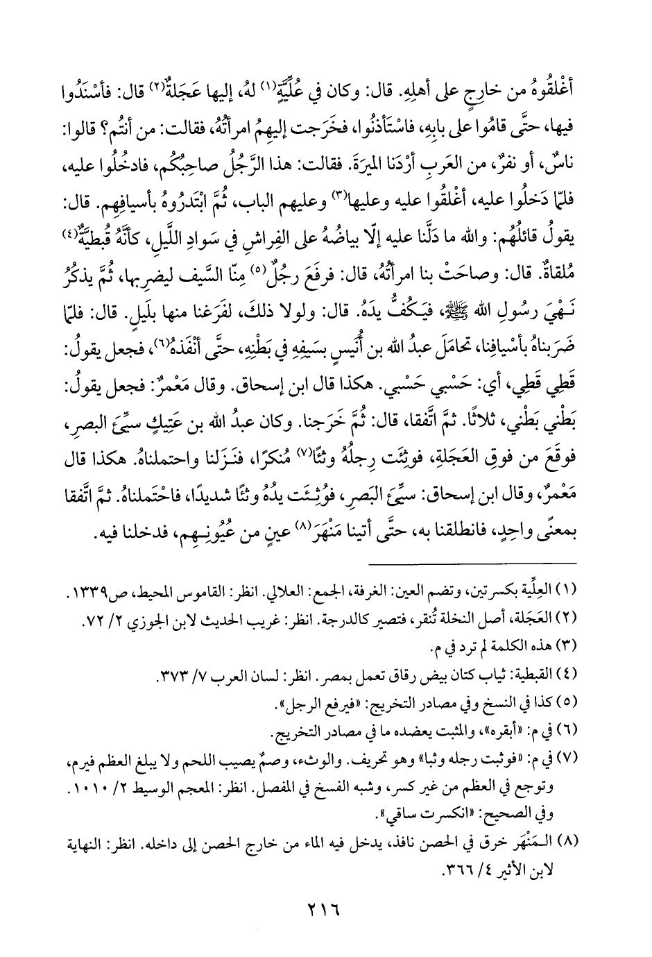 أغْلقُوهُ من خارِجٍ على أهلِهِ. قال: وكان في عُلِّيَّةٍ (¬١) لهُ، إليها عَجَلةٌ (¬٢) قال: فأسْنَدُوا فيها، حتَّى قامُوا على بابِهِ، فاسْتَأذنُوا، فخَرَجت إليهِمُ امرأتُهُ، فقالت: من أنتُم؟ قالوا: ناسٌ، أو نفرٌ، من العَربِ أرْدَنا الميرَةَ. فقالت: هذا الرَّجُلُ صاحِبُكُم، فادخُلُوا عليه، فلمّا دَخلُوا عليه، أغْلقُوا عليه وعليها (¬٣) وعليهم الباب، ثُمَّ ابْتَدرُوهُ بأسيافِهِم. قال: يقولُ قائلُهُم: والله ما دَلَّنا عليه إلّا بياضُهُ على الفِراشِ في سَوادِ اللَّيلِ، كأنَّهُ قُبطيَّةٌ (¬٤) مُلقاةٌ. قال: وصاحَتْ بنا امرأتُهُ، قال: فرفَعَ رجُلٌ (¬٥) مِنّا السَّيف ليضرِبها، ثُمَّ يذكُرُ نَهْيَ رسُولِ الله - صلى الله عليه وسلم -، فيَكُفُّ يدَهُ. قال: ولولا ذلكَ، لفَرَغنا منها بلَيلٍ. قال: فلمّا ضَرَبناهُ بأسْيافِنا، تحامَلَ عبدُ الله بن أُنَيسٍ بسَيفهِ في بَطْنِهِ، حتَّى أنْفَذهُ (¬٦)، فجعل يقولُ: قَطِي قَطِي، أي: حَسْبي حَسْبي. هكذا قال ابن إسحاق. وقال مَعْمرٌ: فجعل يقولُ: بَطْني بَطْني، ثلاثًا. ثمَّ اتَّفقا، قال: ثُمَّ خَرَجنا. وكان عبدُ الله بن عَتِيكٍ سيِّئَ البصرِ، فوقَعَ من فوقِ العَجَلةِ، فوثِئَت رِجلُهُ وثئًا (¬٧) مُنكرًا، فنَزَلنا واحتملناهُ. هكذا قال مَعْمرٌ، وقال ابن إسحاق: سيِّئَ البَصرِ، فوُثِئَت يدُهُ وثئًا شديدًا، فاحْتَملناهُ. ثمَّ اتَّفقا بمعنًى واحِدٍ، فانطلقنا به، حتَّى أتينا مَنْهَرَ (¬٨) عينٍ من عُيُونِهِم، فدخلنا فيه.