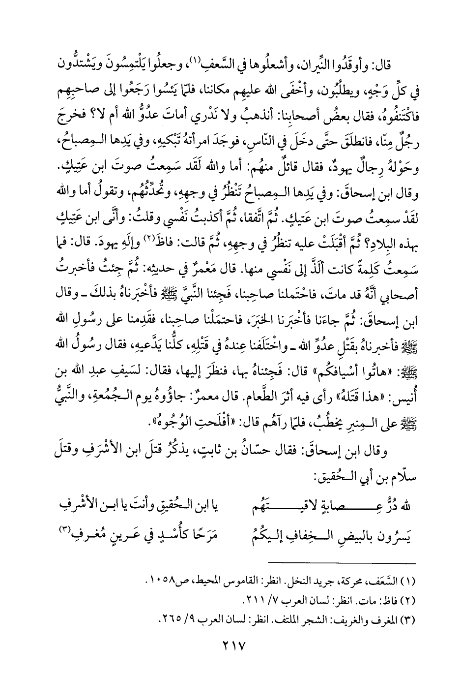وقال ابن إسحاقَ: فقال حسّانُ بن ثابتٍ، يذكُرُ قتلَ ابن الأشرَفِ وقتلَ سلّام بن أبي الحُقيق: