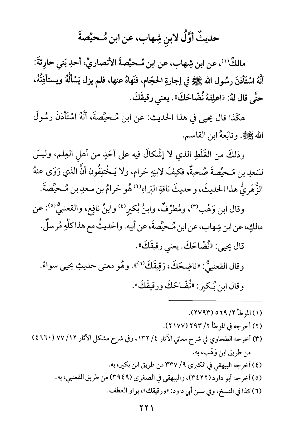 مالكٌ (¬١)، عن ابن شِهاب، عن ابن مُحيِّصةَ الأنصاريِّ، أحدِ بَني حارِثةَ: أنَّهُ اسْتَأذنَ رسُول الله - صَلَّى اللهُ عَلَيْهِ وَسَلَّمَ - في إجارةِ الحجّام، فنَهاهُ عنها، فلم يزل يَسْأُلُه ويستأذِنُهُ، حتَّى قال لهُ: "اعلِفهُ نُضّاحَكَ". يعني رقيقَكَ.