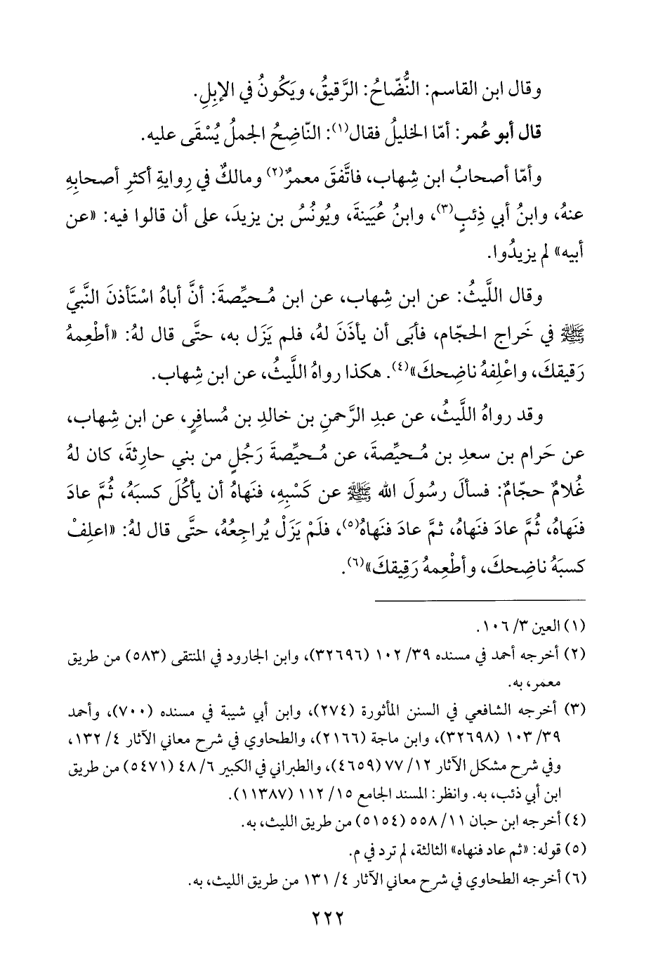 وقد رواهُ اللَّيثُ، عن عبدِ الرَّحمنِ بن خالدِ بن مُسافِرٍ، عن ابن شِهاب، عن حَرام بن سعدِ بن مُحيِّصةَ، عن مُحيِّصةَ رَجُلٍ من بني حارِثةَ، كان لهُ غُلامٌ حجّامٌ: فسالَ رسُولَ الله - صَلَّى اللهُ عَلَيْهِ وَسَلَّمَ - عن كَسْبِهِ، فنَهاهُ أن يأكُلَ كسبَهُ، ثُمَّ عادَ فنَهاهُ، ثُمَّ عادَ فنَهاهُ، ثمَّ عادَ فنَهاهُ (¬٥)، فلَمْ يَزَلْ يُراجِعُهُ، حتَّى قال لهُ: "اعلِفْ كسبَهُ ناضِحكَ، وأطْعِمهُ رَقِيقكَ" (¬٦).